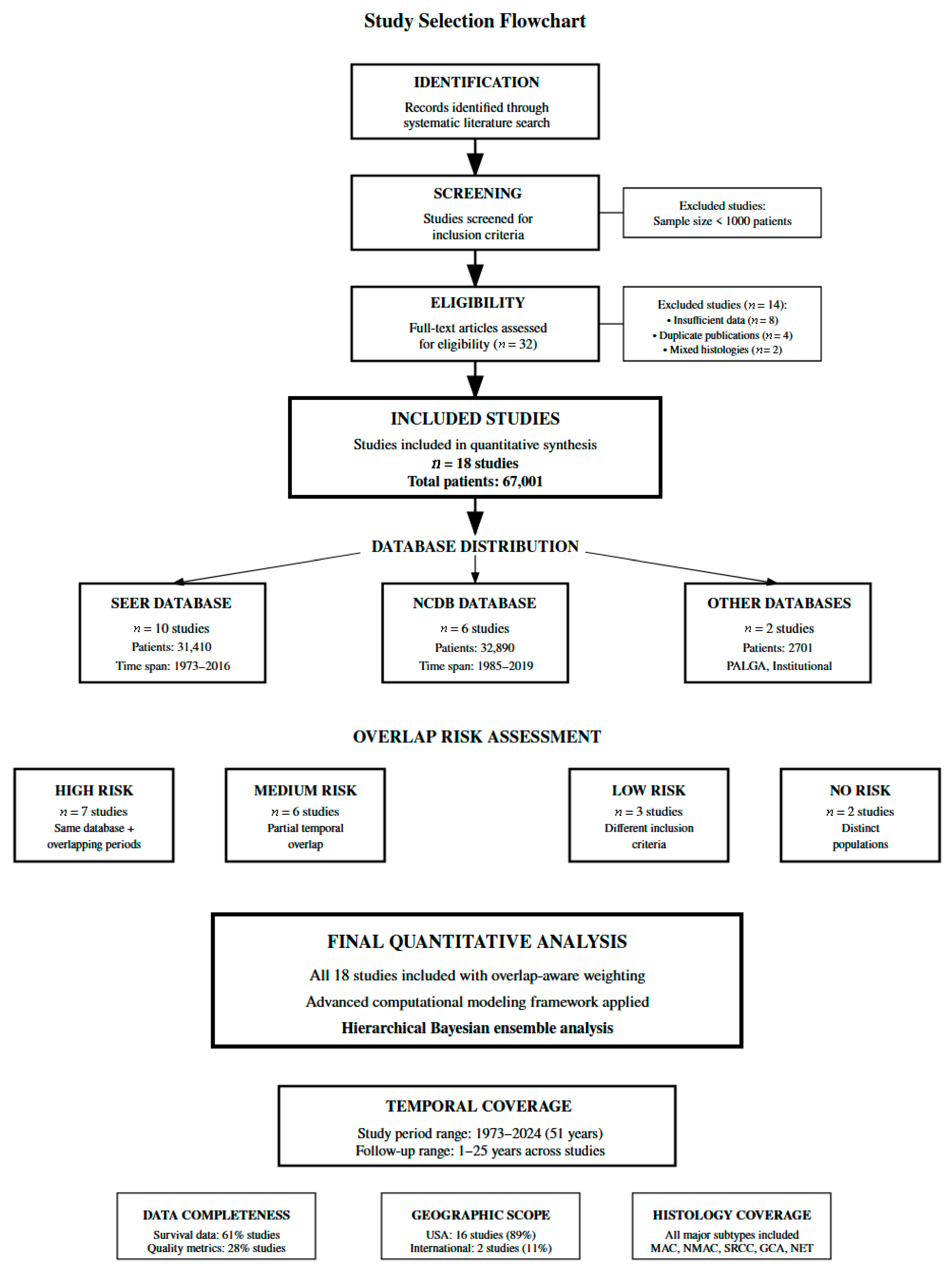 | Wang et al., 2023 [30] | SEER | 2004–2015 | 2891 | Population-based | 62 | 45.9% | MAC: 25.6%; NMAC: 21.4%; SRCC: 5.6%; NET: 47.3% | Localized: 45.7%; Regional: 29.9%; Distant: 24.4% | Chemotherapy: 30.5% | NR | Median OS: 65 months (chemotherapy group); 5-year OS: 51.9% (chemotherapy group) | MEDIUM |