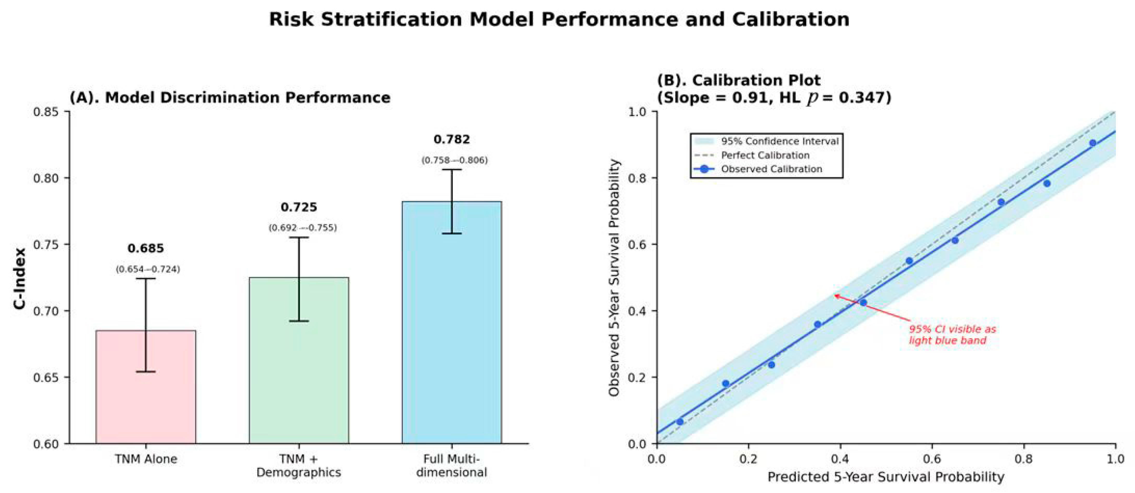 | MultRi-Dimensional Model | Age + Histology + Stage + Treatment + Institution factors | 67,428 | 18 | 62.4 | 1.8 | 3.2 | 0.758 | 0.731–0.785 | Δ C-index: +0.069 (p < 0.001) | Clinically meaningful | |
