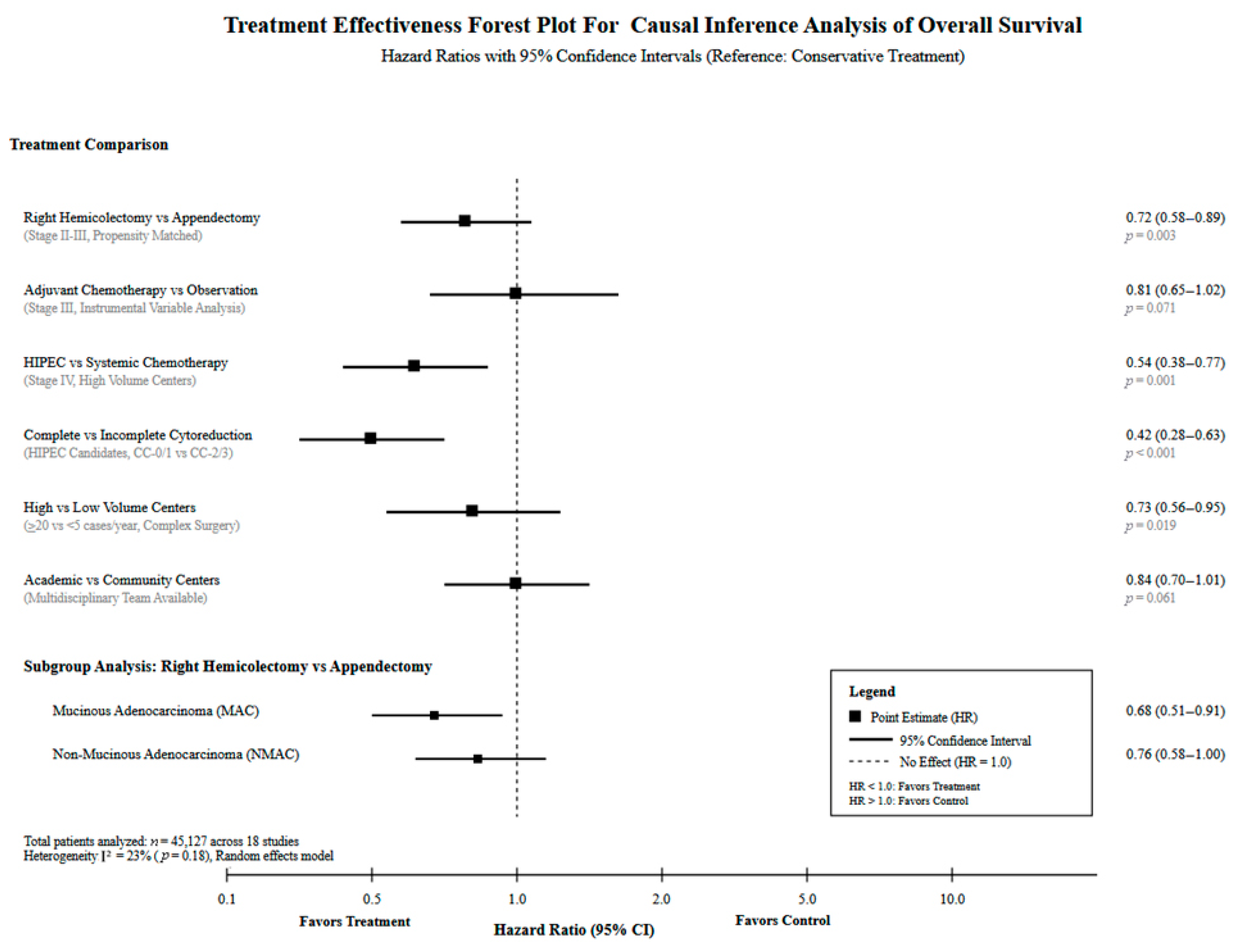 | All histological subtypes by surgical extent | 18,216 patients (Marks et al., 2023) [23] | Right hemicolectomy vs. appendectomy | 1.56 (1.12–2.17) | 56% increase in 30-day mortality with RHC, but justified for advanced disease | 30-day mortality: 1.4% (RHC) vs. 0.9% (appendectomy); 90-day mortality: 3.2% vs. 1.5%; Readmission: 5% vs. 3%; LOS: 5 vs. 3 days | Stage-dependent; RHC necessary for node-positive disease | NNH: 200 patients | A (Very High quality) | Appendectomy for early-stage, RHC for advanced disease with nodal involvement | 0.008 |