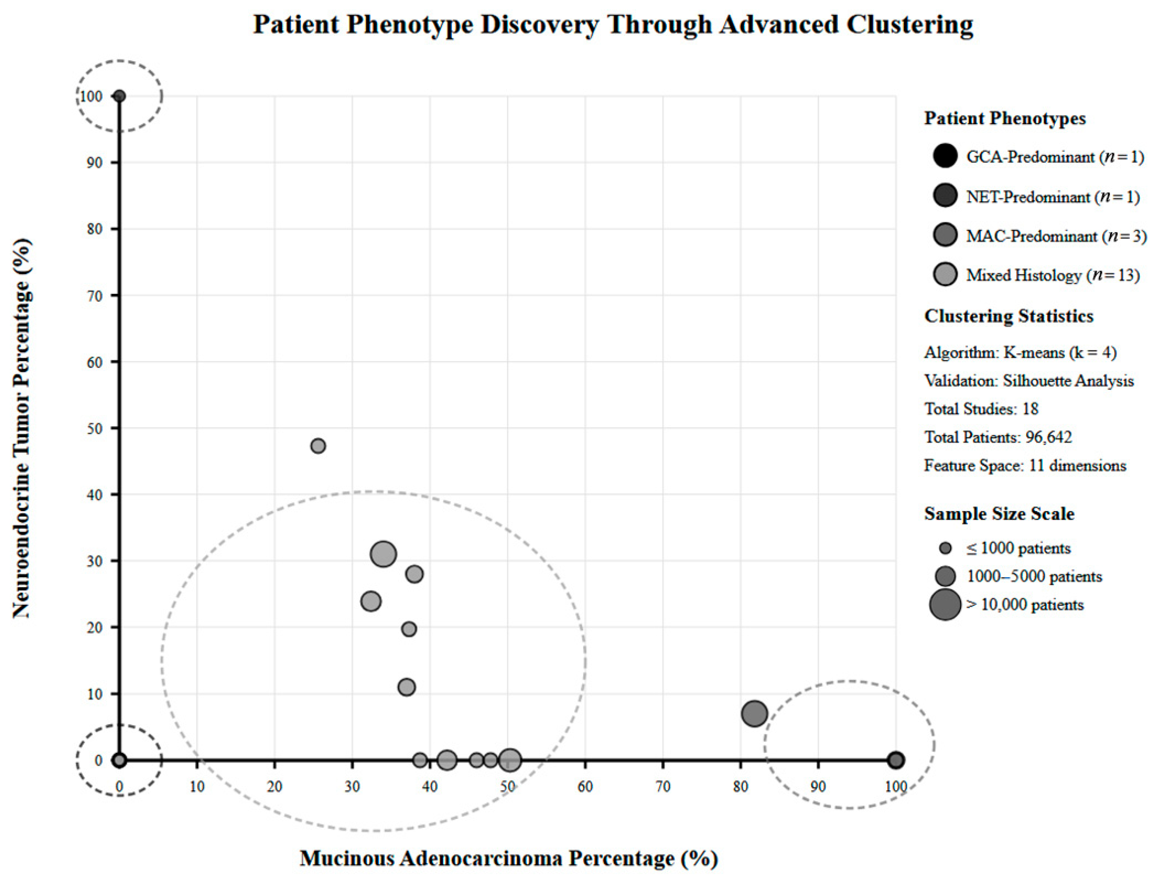 | Chemotherapy effectiveness by histology | 8733 patients (Wang et al., 2021) [31] | Chemotherapy benefit: MAC vs. NMAC vs. SRCC | MAC: 0.85 (0.76–0.95); NMAC: 0.92 (0.84–1.01); SRCC: 1.15 (0.98–1.35) | Histology-dependent chemotherapy effectiveness (MAC > NMAC > SRCC) | Selection bias evident in overall chemotherapy studies | 5-year OS with chemotherapy: MAC 65.8%, NMAC 56.2%, SRCC 48.2% | NNT: MAC 10 patients; NMAC 26 patients; SRCC no benefit | B (High quality for MAC, moderate for others) | Prioritize chemotherapy for MAC, consider for NMAC, limited benefit in SRCC | MAC: 0.003; NMAC: 0.08; SRCC: 0.12 |