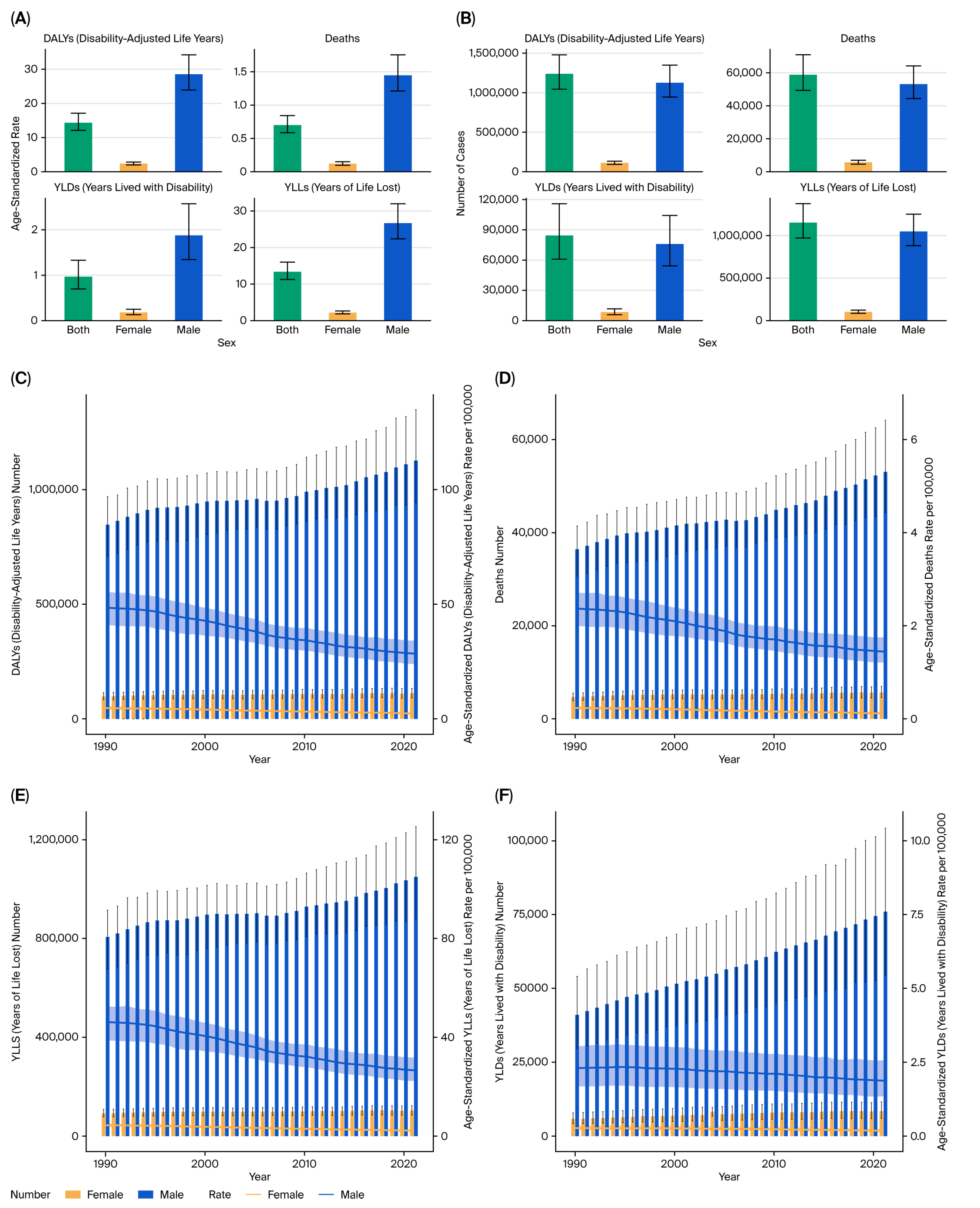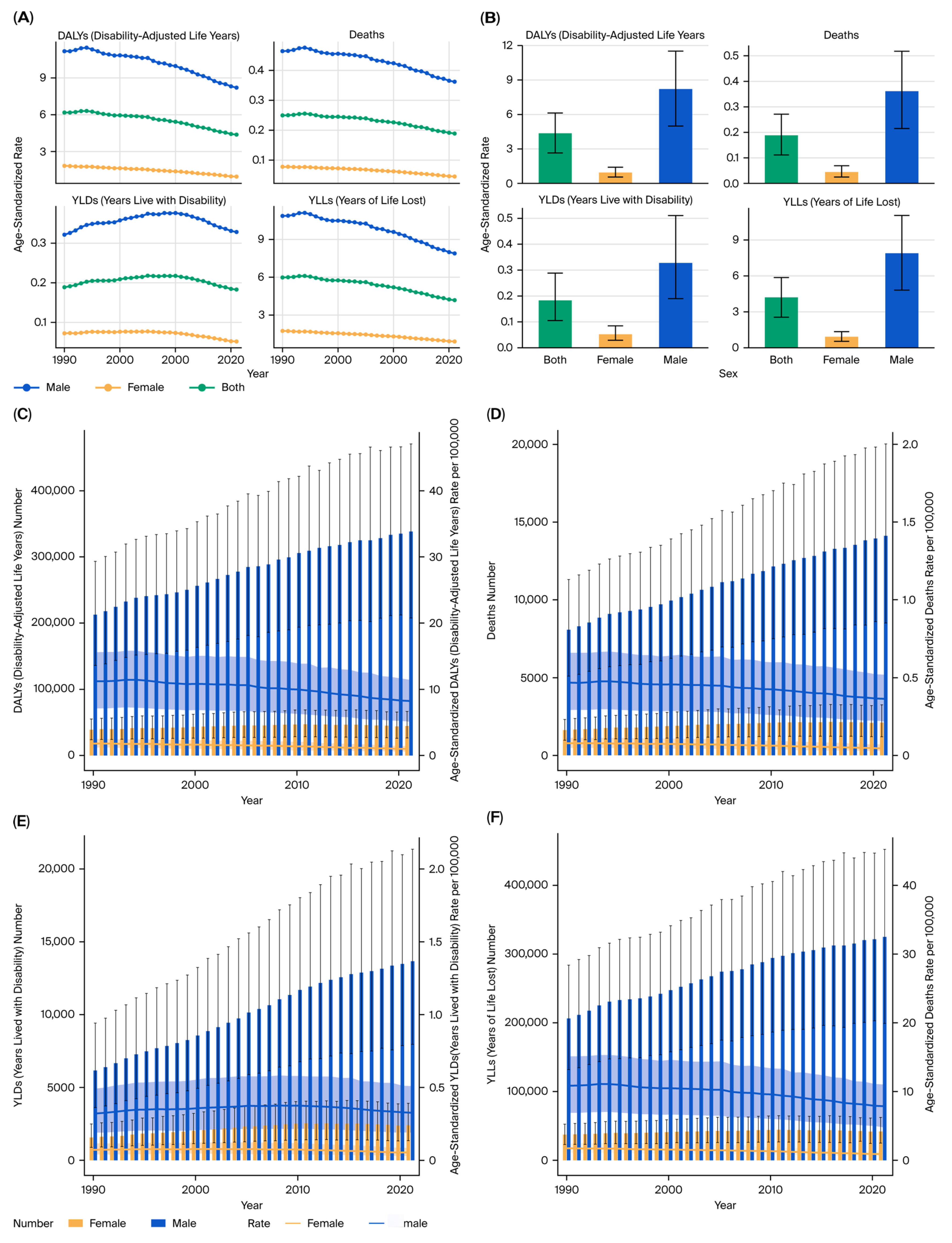 Figure 13. Sex-specific burden of bladder cancer due to tobacco smoke (2021). (A) Age-standardized DALY rate by sex. (B) Temporal DALY trend by sex. (C) Temporal deaths trend by sex. (D) Temporal YLLs by sex. (E) Temporal YLDs by sex. (F) Male-to-female burden ratio over time.