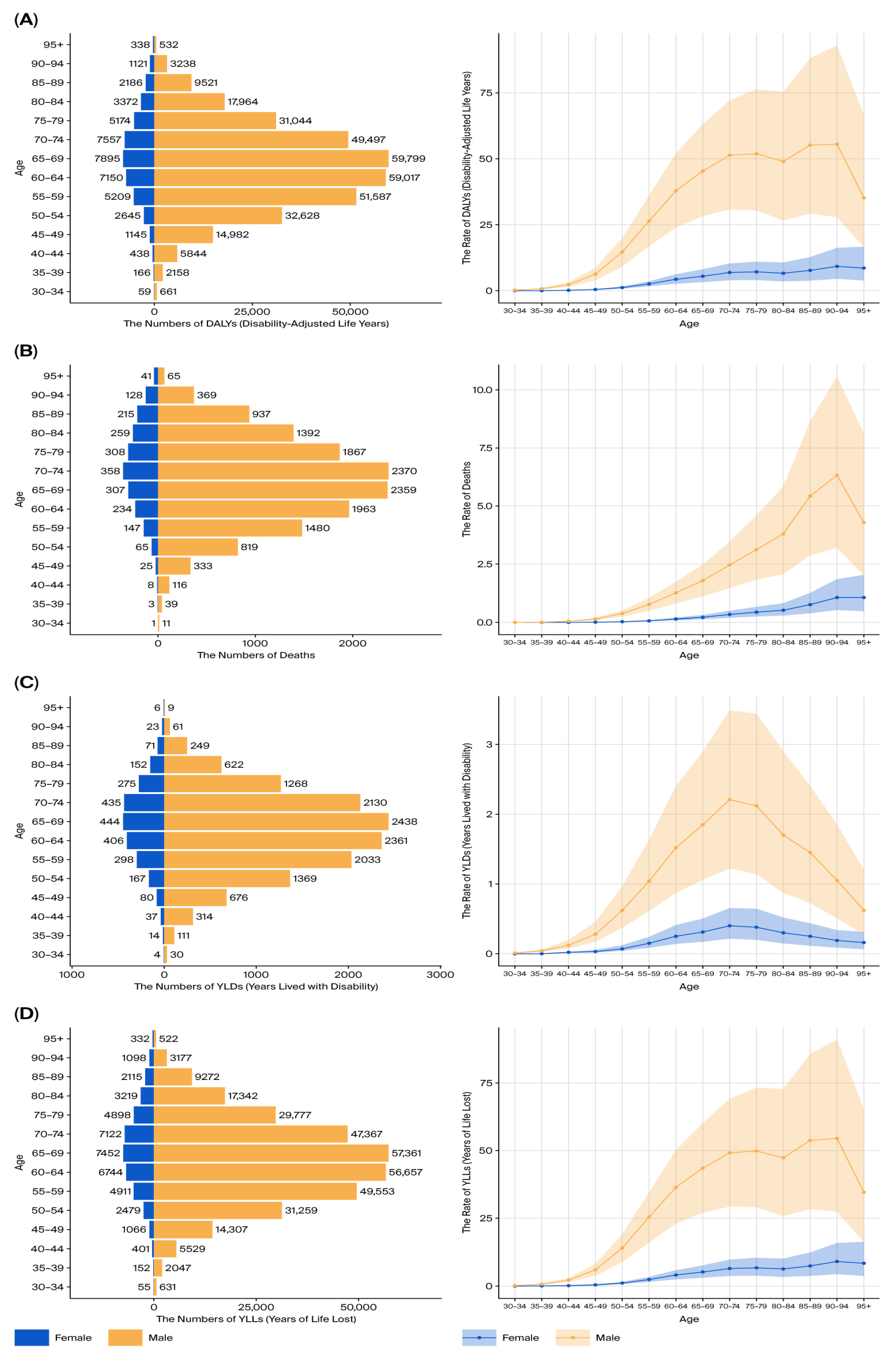 Figure 14. Age-specific bladder cancer burden by sex (2021). (A) DALYs by sex and age. (B) Deaths by sex and age. (C) YLLs by sex and age. (D) YLDs by sex and age.
