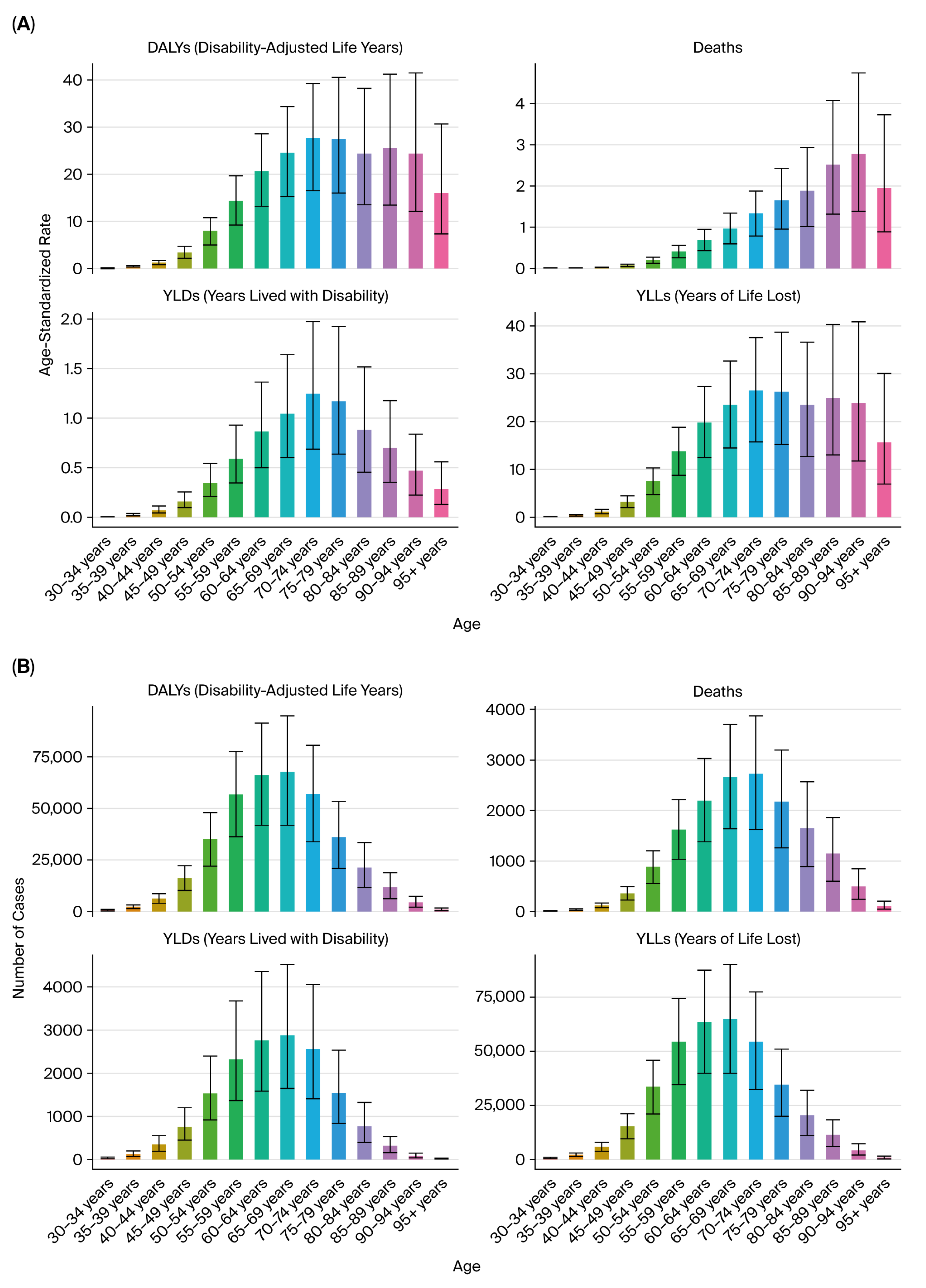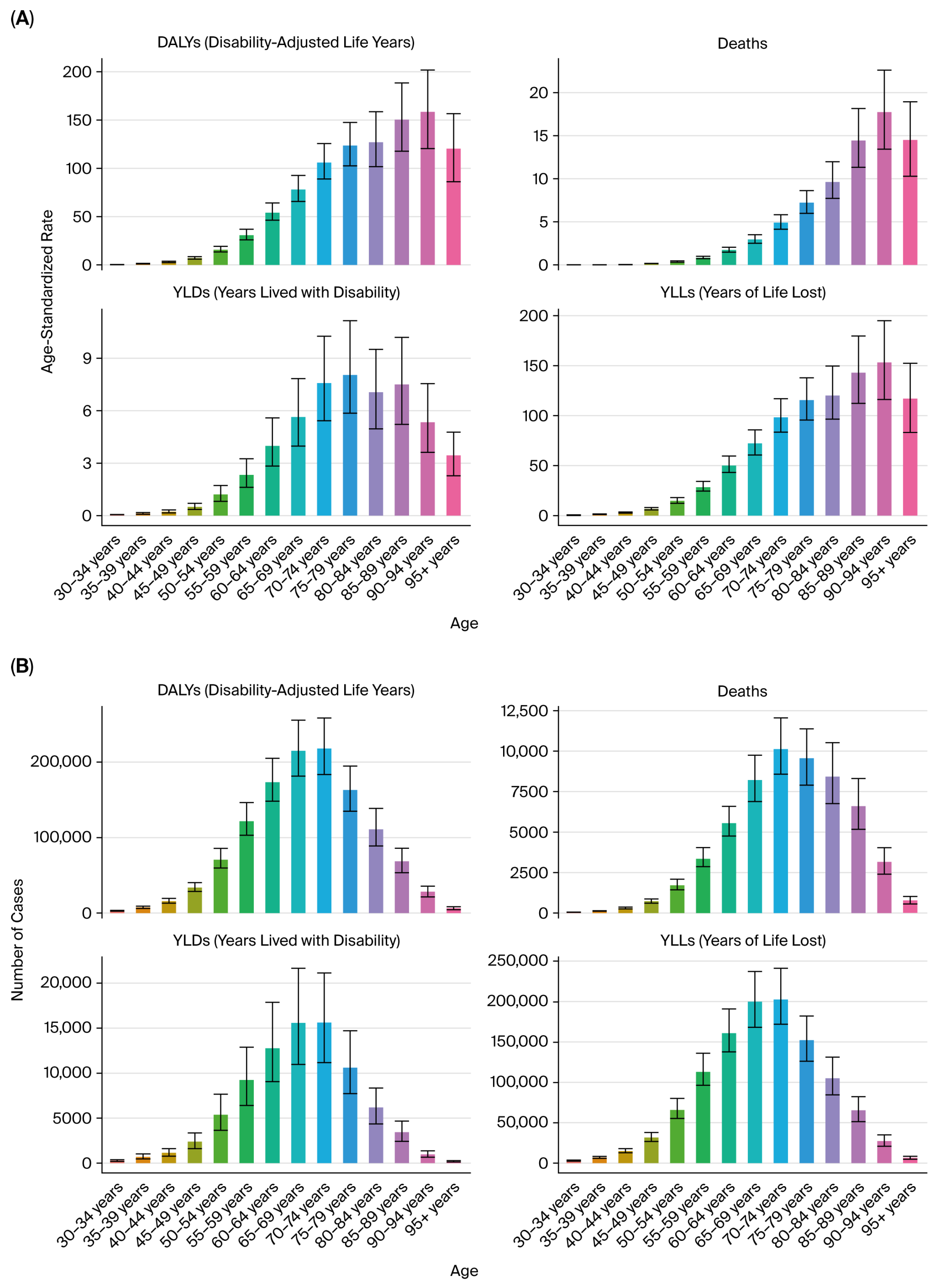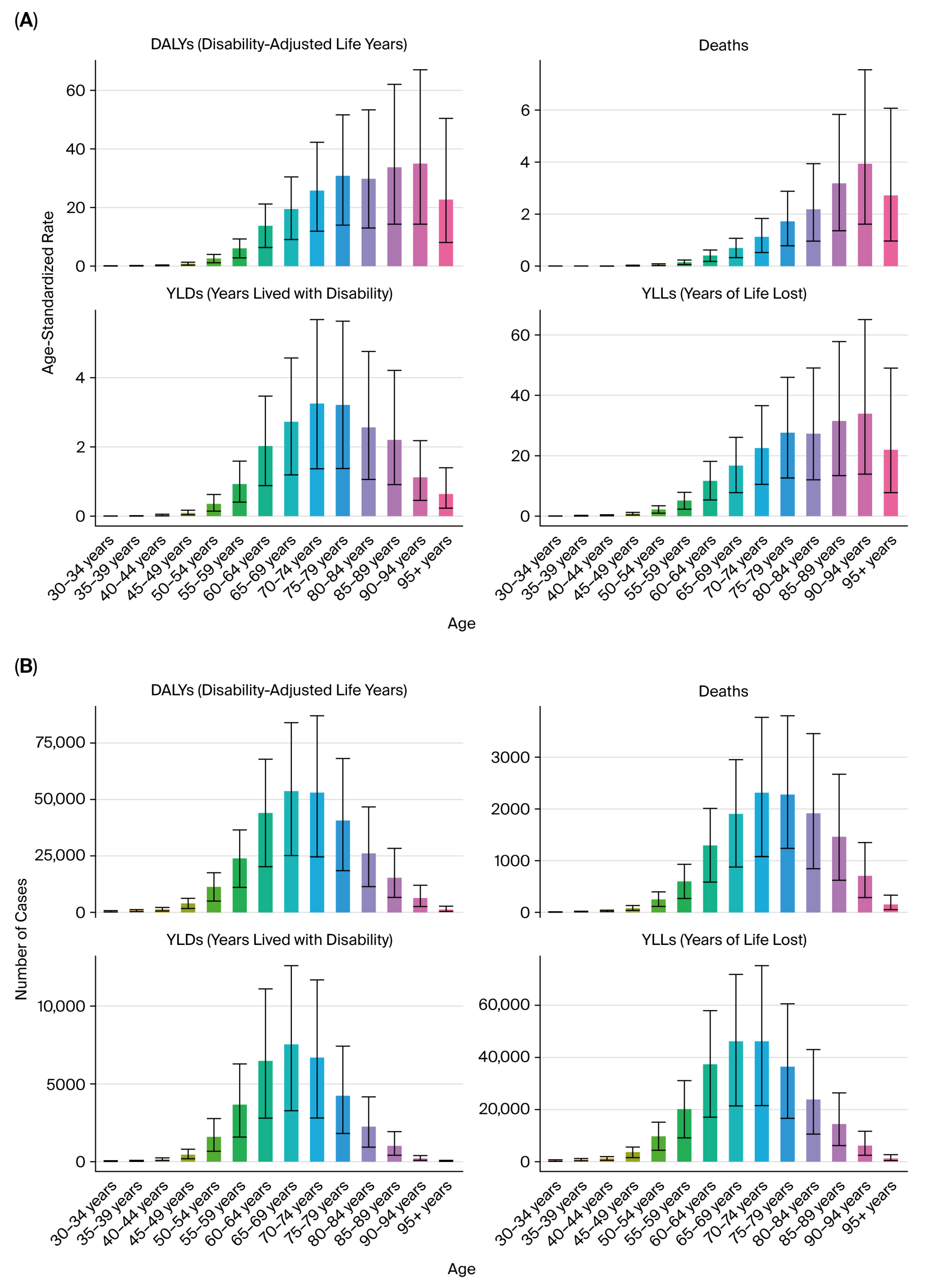 Figure 15. Age distribution of bladder cancer burden in 2021. (A) Age-specific DALYs. (B) Age-specific deaths.