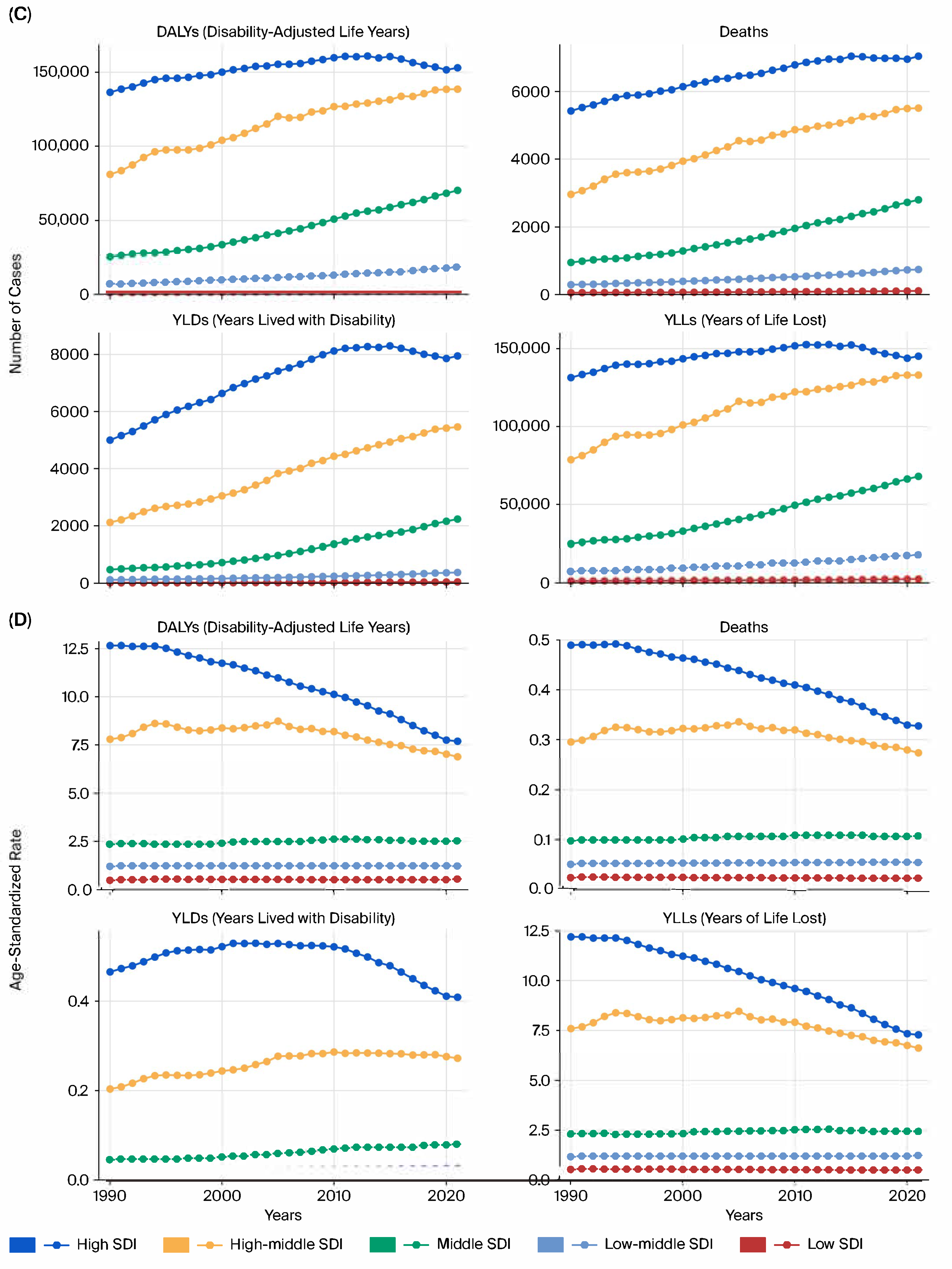Geographically, high-SDI countries accounted for the largest number of total DALYs, deaths, YLLs, and YLDs in absolute terms, while middle- and low-middle SDI regions showed the most pronounced increases in age-standardized rates over time (Figure 5A–D).