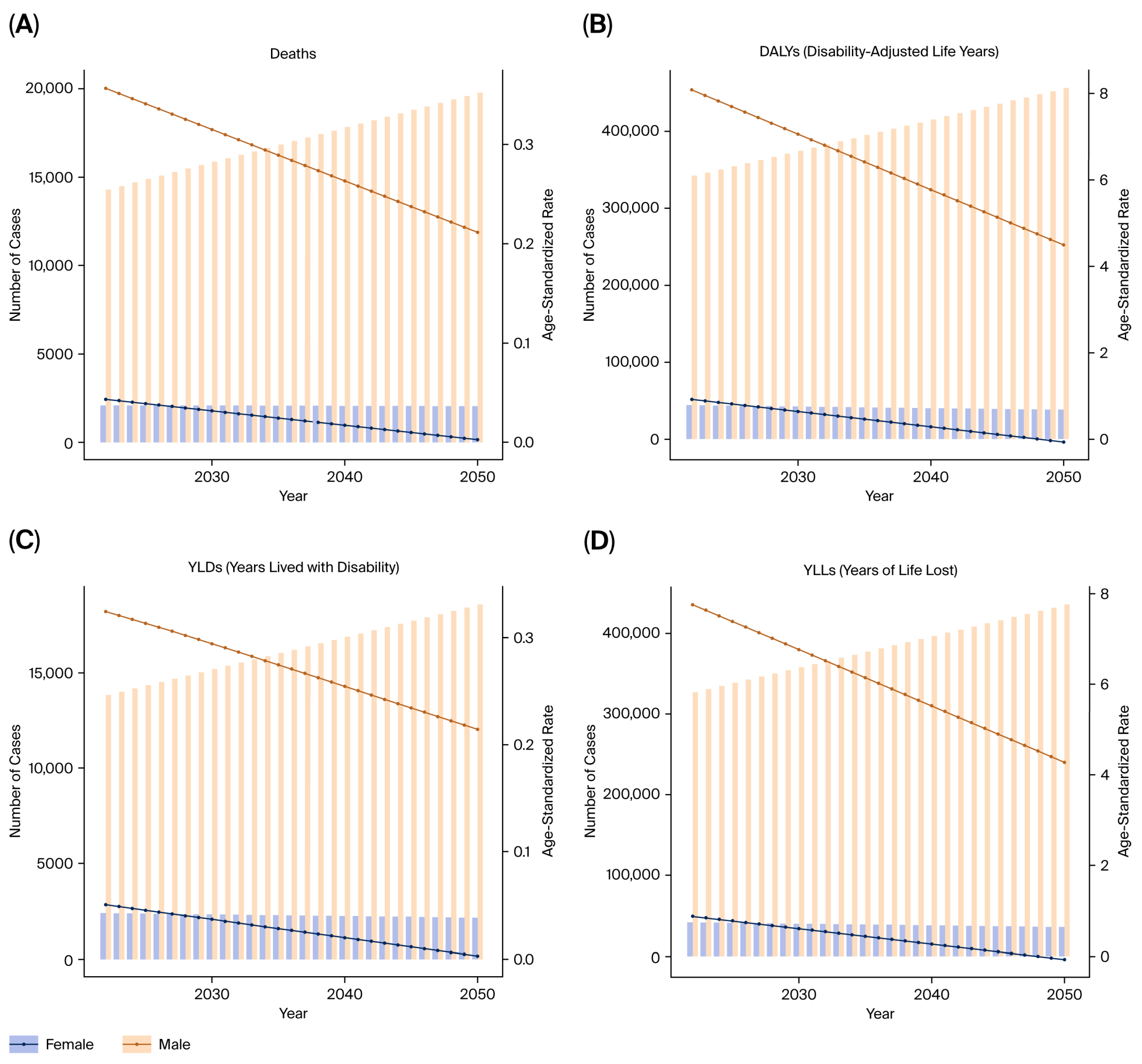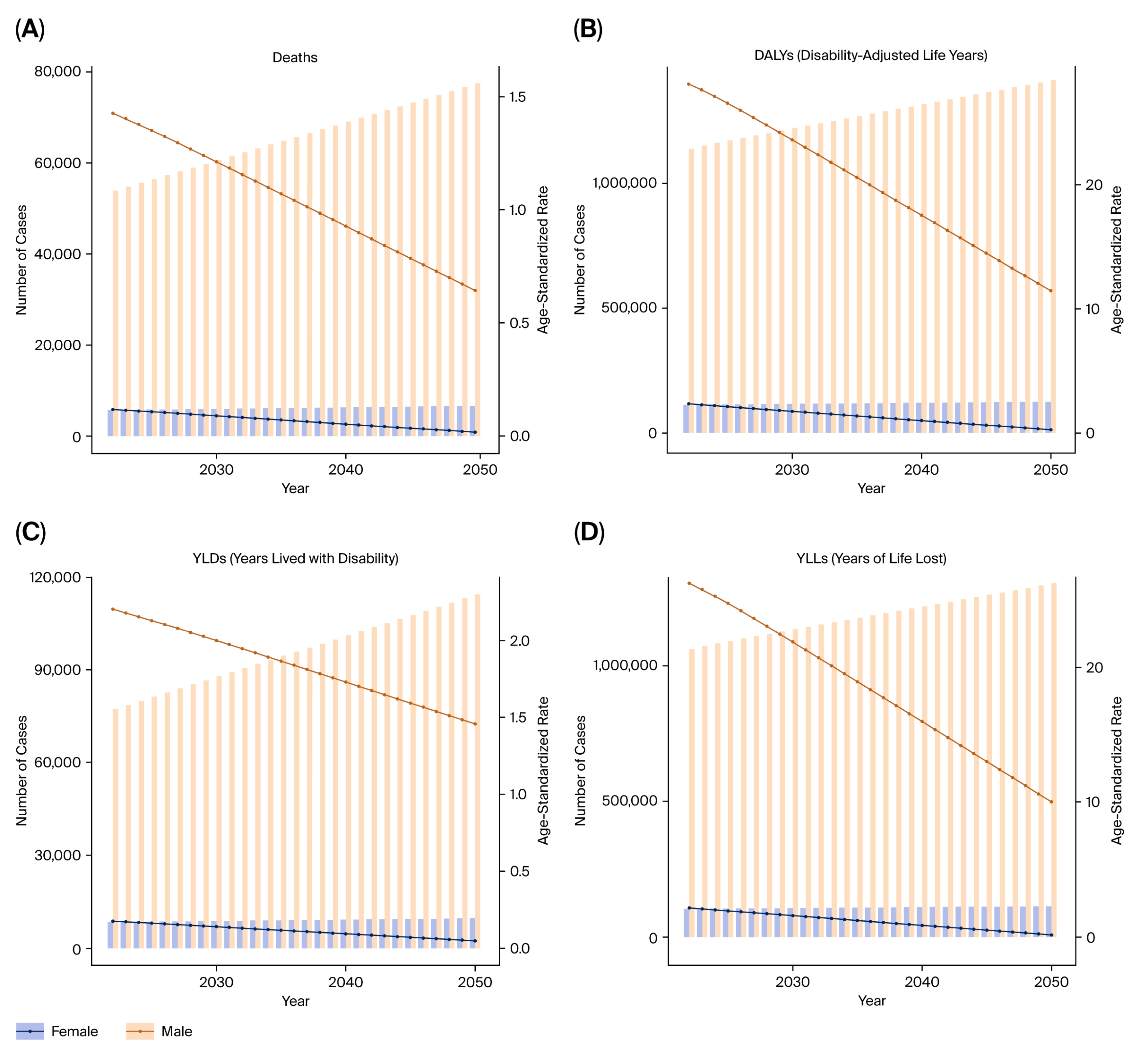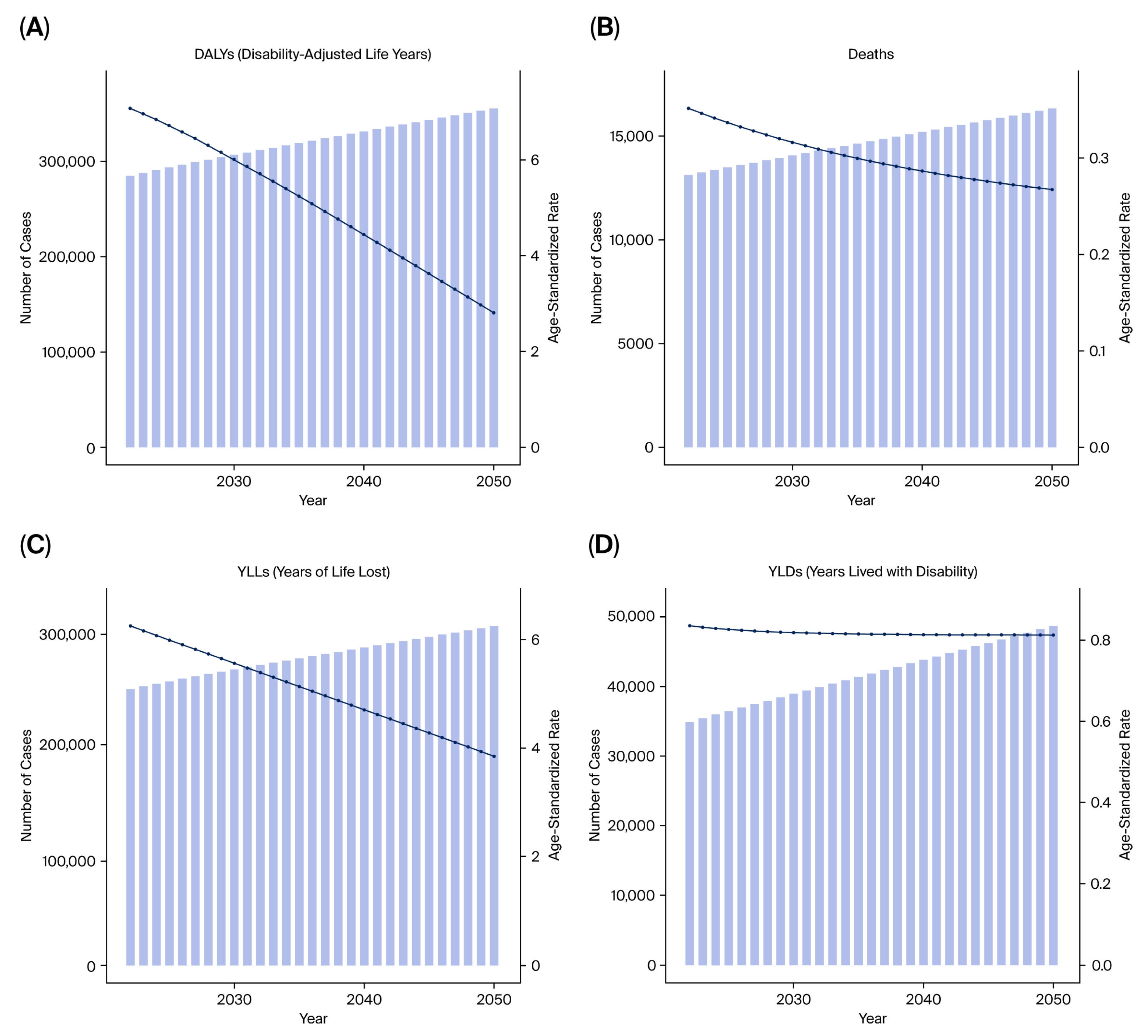 Figure 11. Projected burden of prostate cancer from tobacco exposure until 2050. (A) Predicted DALYs. (B) Predicted deaths. (C) Predicted YLLs. (D) Predicted YLDs.