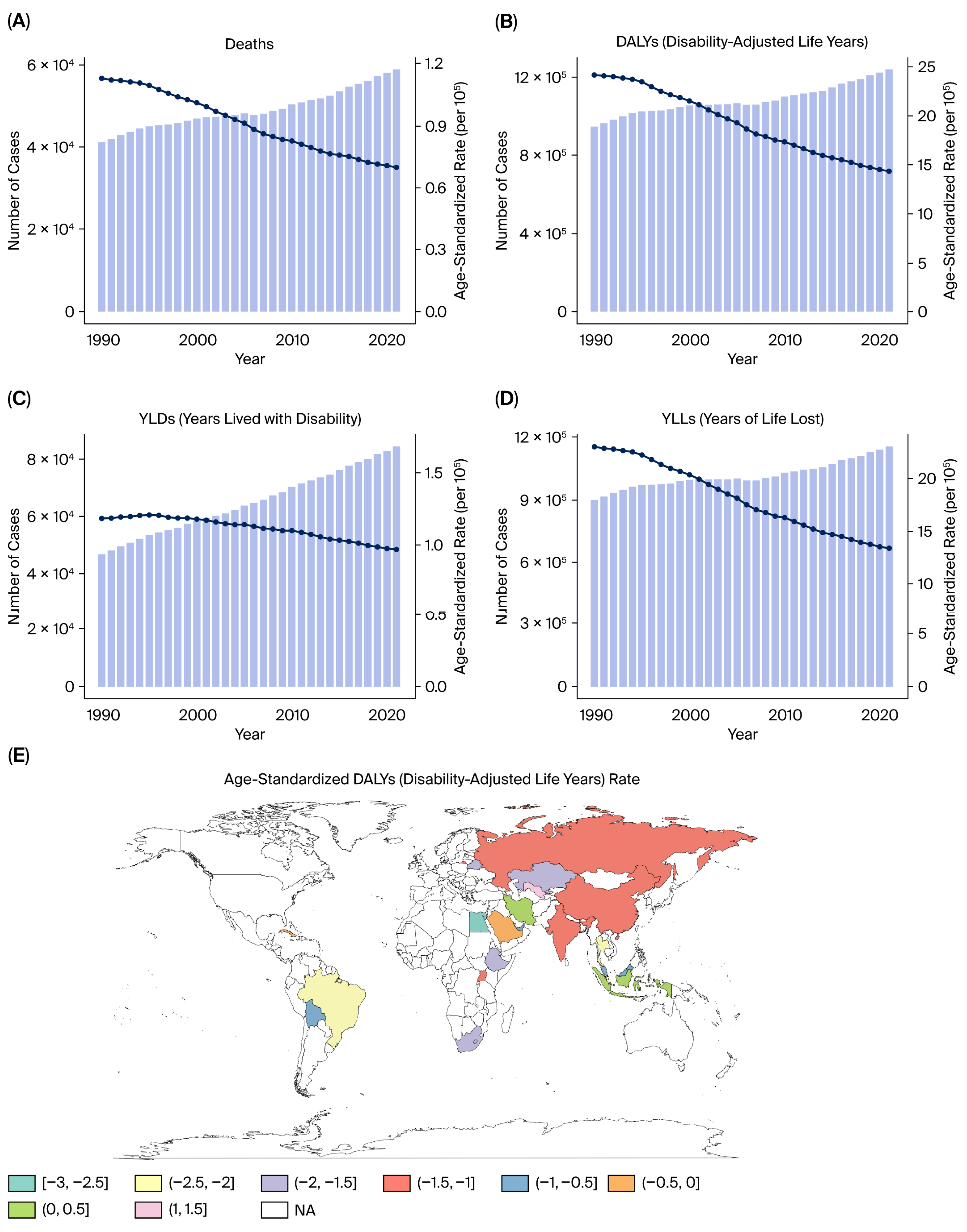 The Global Burden of Disease (GBD) study framework provides a comprehensive approach to quantifying disease burden and its associated risk factors across countries and time periods. Within this framework, the estimated annual percentage change (EAPC) is commonly used to describe temporal trends in age-standardized rates and allows for comparison of changing burdens among different populations.