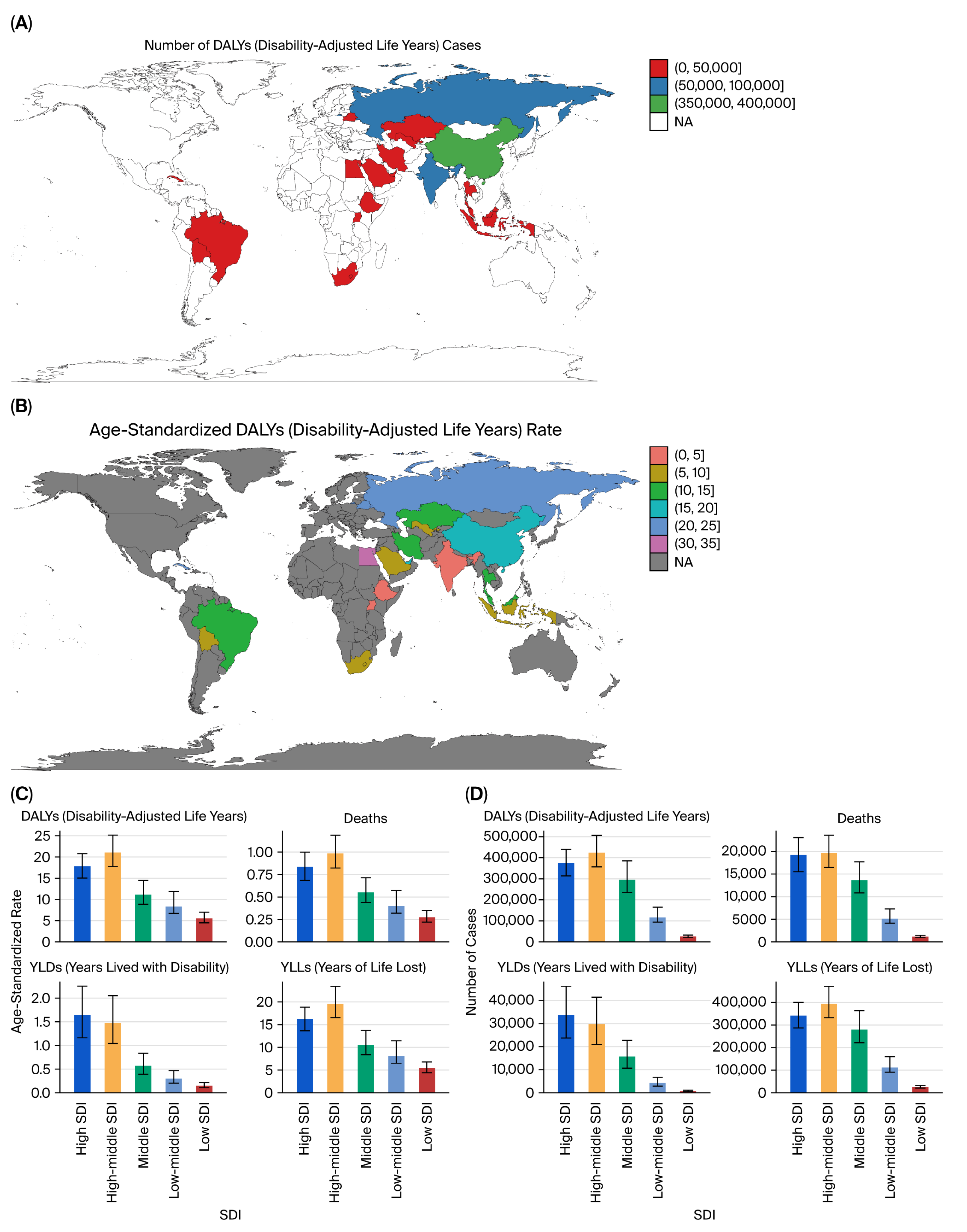 Figure 10. Geographic distribution of prostate cancer burden (2021). (A) Deaths by country. (B) Total DALYs by country. (C) Age-standardized DALY rate by SDI. (D) Total DALYs by SDI quintile.