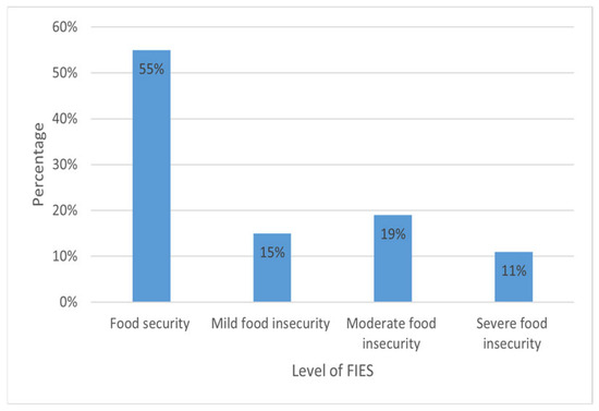Food insecurity was assessed with the Food Insecurity Experience Scale (FIES), a validated experience-based instrument developed by the Food and Agriculture Organization (FAO). The scale has good reliability and internal consistency (Cronbach’s α = 0.759) [39]. This eight-item scale assesses the experiences of people with respect to food security within the last 12 months. In this study, the participants were also asked whether they had ever worried about not having enough food, used all the food they had at home, or reduced the quality or quantity of food they consumed because they did not have enough money or food. Each affirmative response (“yes”) was assigned 1 point, whereas negative responses (“no”) were assigned 0 points. A total score ranging from 0 to 8 was obtained by summing the scores from all eight items. The respondents’ food insecurity statuses were categorized according to the total score, as follows: food security (score = 0), mild food insecurity (score = 1–3), moderate food insecurity (score = 4–6), and severe food insecurity (score = 7–8) [40,41]. Subsequently, items 1, 2, 3, 4, 5, 6, 7, and 8 were combined to obtain a single variable. This variable classified households with a score of 4 or higher (≥4) as having moderate-to-severe Food Insecurity (FI) and those with a score between 0 and 3 as having no or low Food Insecurity (FI) [42].
