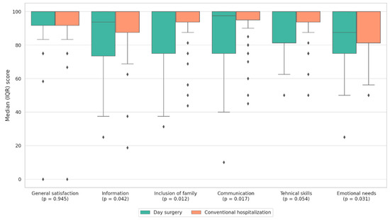Distribution of parental satisfaction scores across PedsQL™ 3.0 subscales comparing day surgery and conventional hospitalization. Both groups reported high satisfaction overall, while significantly higher scores for information, family involvement, communication, and emotional support were observed among parents in the conventional hospitalization group.