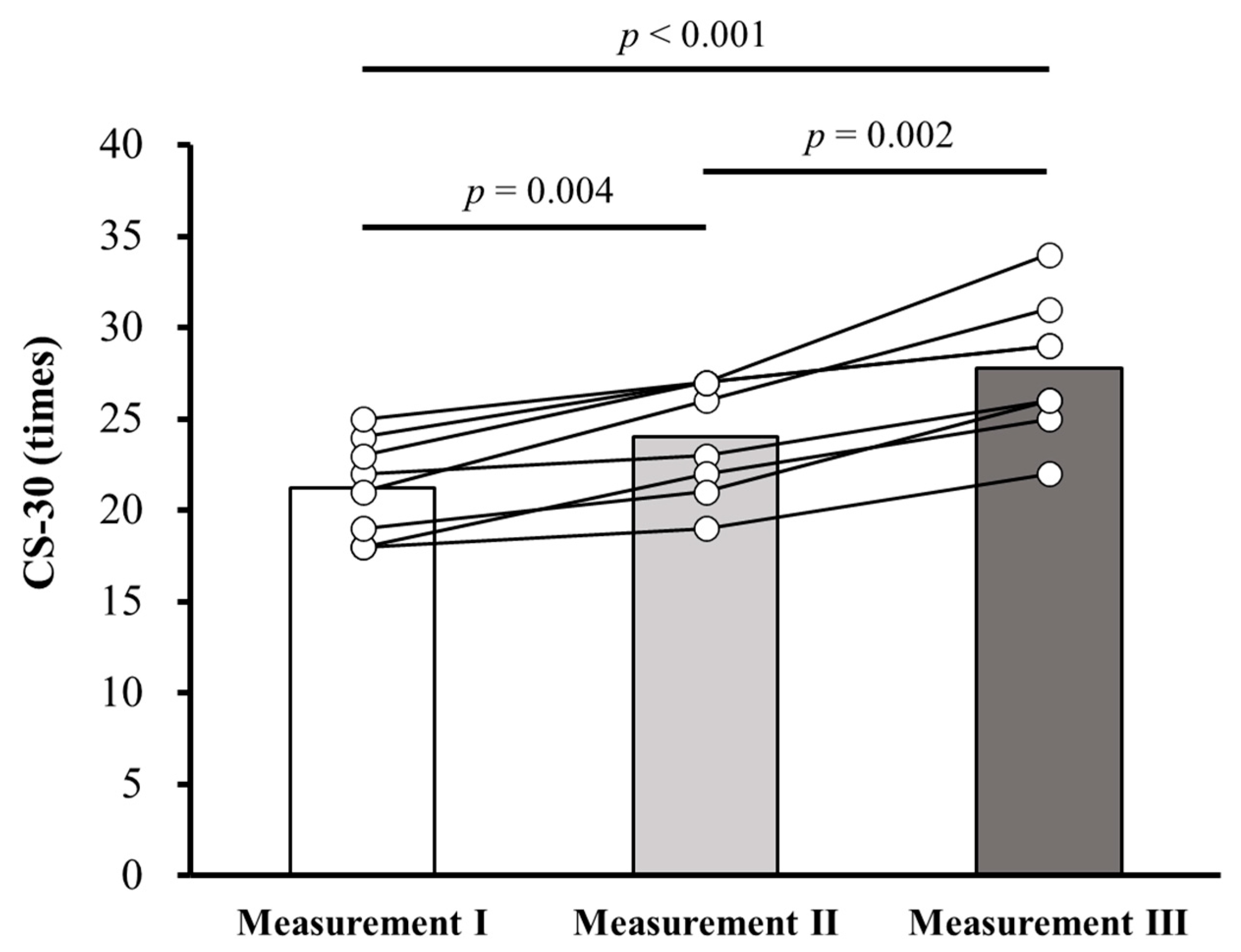 Table 2 presents changes in CS-30 times, total KCL scores, and total GLFS-25 scores over 14 weeks (Measurements 1–3). A significant main effect of time was observed for CS-30 (F = 50.38, p < 0.001, η p 2 = 0.878), whereas no significant main effects of time were found for KCL (p = 0.112) or GLFS-25 (p = 0.542) scores. Post hoc analyses revealed significant improvements in CS-30 performance following both the OEC (Measurement 1 vs. Measurement 2; 21.3 ± 2.7 vs. 24.0 ± 3.2, mean difference: 2.75, 95% confidence interval (CI): 1.11–4.40, p = 0.004; Figure 1) and SDE (Measurement 2 vs. Measurement 3; 24.0 ± 3.2 vs. 27.8 ± 3.8, mean difference: 3.75, 95% CI: 1.81–5.69, p = 0.002; Figure 1) periods.