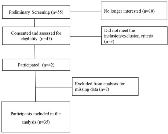 A total of 55 individuals were initially screened. Of these, 10 lost interest, leaving 45 who consented and were assessed for eligibility. Among them, 3 did not meet the inclusion/exclusion criteria, resulting in 42 participants who took part in the study. During data processing, 7 participants were excluded due to missing data, leading to a final sample of 35 participants included in the analysis (Figure 1).