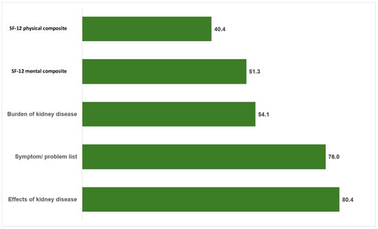 The mean scores of the KDQOL-36 domains—symptom/problem list, effect of kidney disease, burden of kidney disease, SF-12 physical health composite, and SF-12 mental health composite—were 76.0 ± 16.0, 80.4 ± 16.1, 54.1 ± 22.4, 40.4 ± 12.4, and 51.3 ± 10.7, respectively (Figure 2).