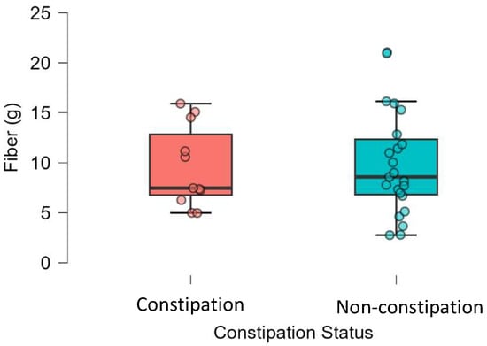 Dietary fiber intake among patients undergoing hemodialysis according to their constipation status (n = 35).