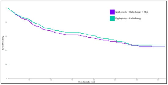 We used prescription of morphine or oxycodone as a surrogate indicator of pain burden, and found no significant difference in utilization between groups. This suggests that, at a population level, adjunctive RFA did not lead to reduced reliance on opioids over one year. This finding is somewhat unexpected given that pain relief is one of the most consistently reported benefits of RFA in published series. Lu et al. summarize multiple reports in which RFA, which is often combined with vertebral augmentation, achieves marked reductions in pain scores and analgesic requirements in spinal metastases []. A recent review also reported significant pain reduction and favorable safety profiles when RFA is combined with vertebroplasty []. Other studies further support these findings of robust pain reductions, although their comparison was not to a matched non-RFA cohort [,,,]. The discrepancy between our results and these reports may reflect several possibilities. First, many prior studies enroll patients specifically for refractory pain and thus may preferentially include those most likely to benefit, whereas our cohort is broader and includes patients treated with RFA for other indications or in heterogeneous pain states []. Second, opioid prescriptions may not perfectly capture pain experience, as some patients may have pain but choose non-opioid pain management, or prescribing practices may differ across institutions []. Accordingly, our opioid-based proxy may be limited by formulary variability, regional prescribing differences, and the absence of non-opioid analgesic data, potentially diluting the detection of RFA’s true analgesic effect, particularly when combined with concurrent radiotherapy or kyphoplasty in a broad-matched cohort. Third, the marginal incremental analgesic benefit of RFA beyond radiotherapy and kyphoplasty may be small and diluted when assessed across a broad matched population []. In other words, while RFA may offer pain relief in selected patients, that benefit did not translate to a measurable difference in opioid prescribing within our study design.