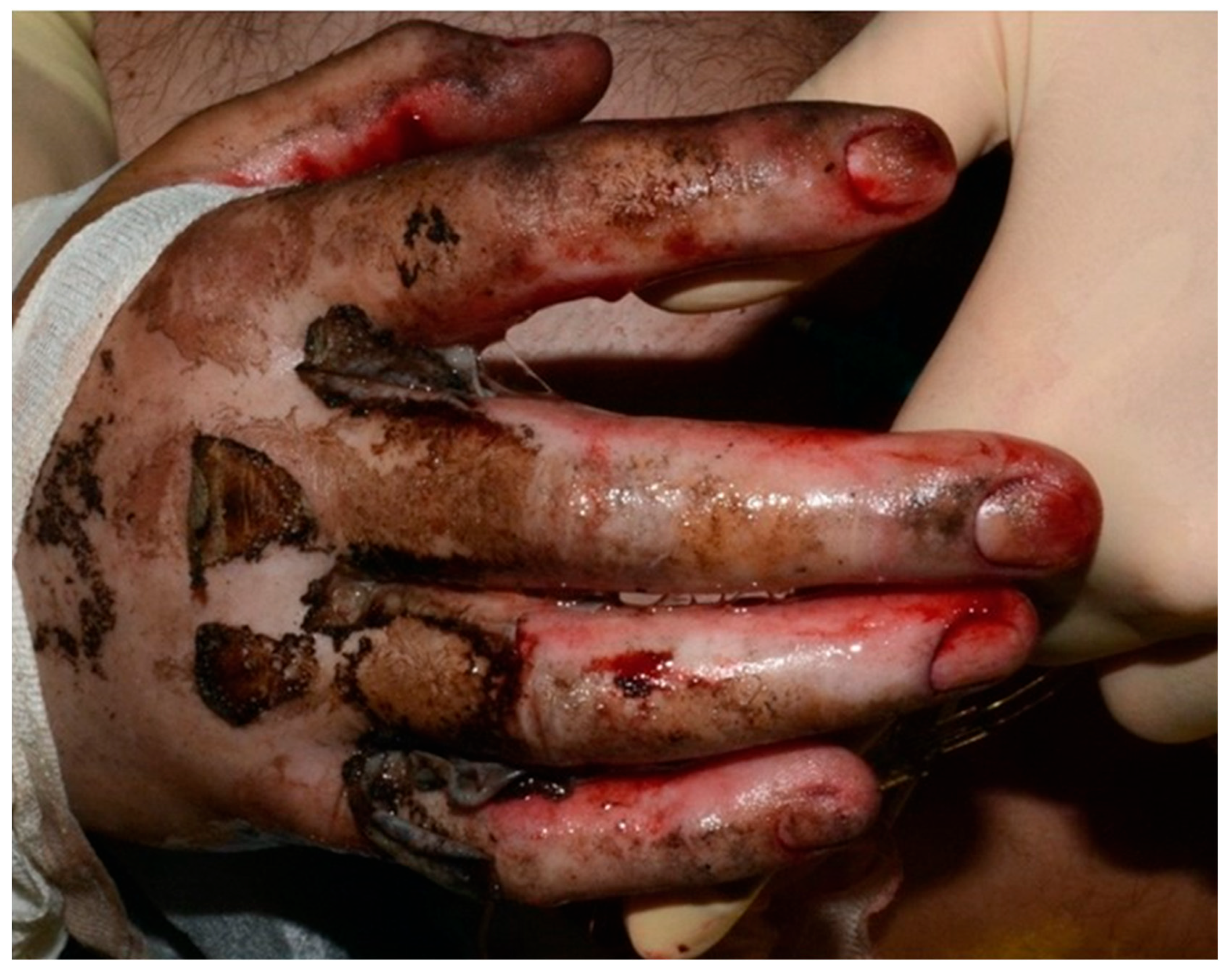 Figure 1). Initial treatment included thermal cleansing and staged surgical intervention beginning with debridement of necrotic tissue and urgent escharotomy to relieve pressure and prevent compartment syndrome in the affected limbs. In the subsequent days, two additional debridement procedures were required to achieve adequate clearance of devitalized tissue. To optimize wound healing and minimize the risk of infection, xenografts (MatriDerm