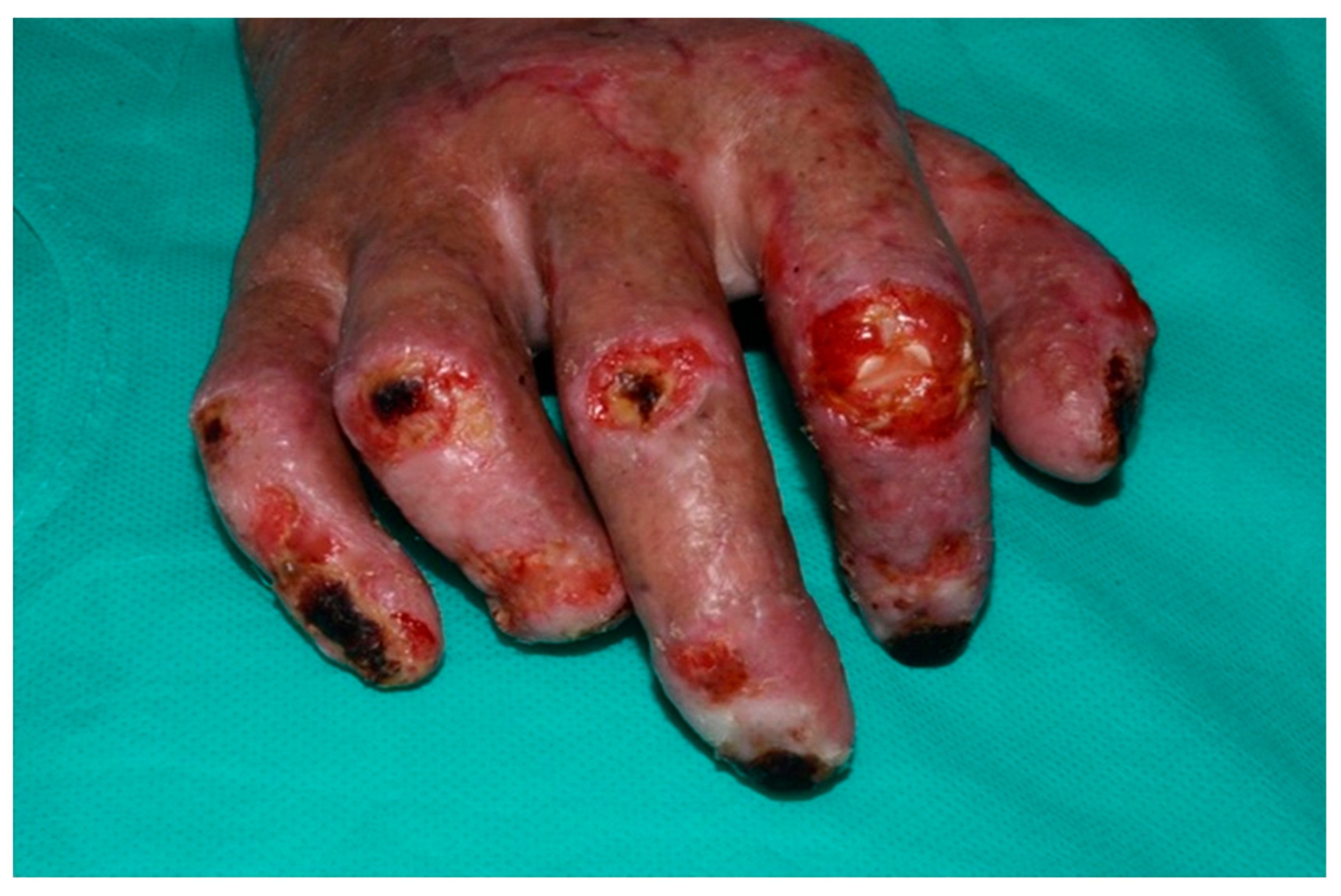 Figure 2). These areas exhibited full-thickness tissue loss with exposed tendons and cartilage, conditions known to impede graft take due to poor vascularization.
