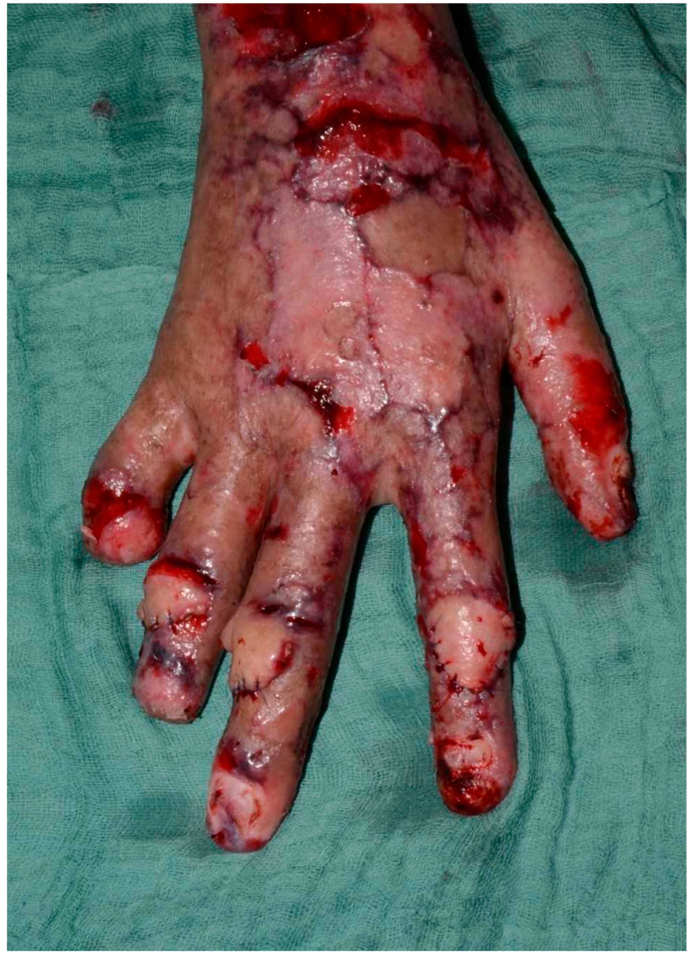 ®) were applied to the wound bed between procedures, serving as temporary biological coverings and aiding in preparation for definitive reconstruction. After the second debridement, split-thickness skin grafting (STSG) was performed to cover burn wounds on the upper limbs. The grafts successfully integrated in most areas. However, on the dorsum of the right hand—specifically over the second, third, and fourth proximal interphalangeal (PIP) joints—graft failure occurred (