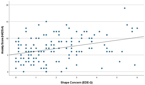 As shown in Figure 1, there was a clear positive association between anxiety symptoms (HADS-A) and Shape Concern scores (EDE-Q), with higher levels of subjective body image concern corresponding to greater psychological distress. Despite the moderate sample, the correlation between subjective body image concerns and anxiety (ρ = 0.032, p < 0.001) remained strong and statistically significant, consistent with patterns observed in larger studies.