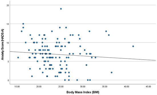 In striking contrast, BMI exhibited no statistically significant correlation with either HADS-A scores (ρ = −0.127, p = 0.138) or HADS-D scores (ρ = 0.065, p = 0.448). In contrast, as illustrated in Figure 2, BMI showed no clear relationship with anxiety symptoms, with data points dispersed and the regression line close to flat, visually confirming the lack of a statistically significant association. The absence of a statistically significant association between BMI and psychological distress further reinforces the primacy of subjective perceptions, a result that holds despite the sample size.
