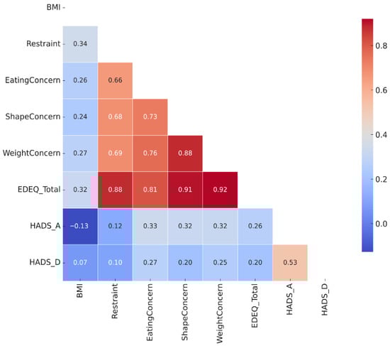 Spearman’s correlation analysis revealed significant associations between subjective body image concerns and symptoms of anxiety and depression. Specifically, higher scores on the HADS anxiety subscale (HADS-A) were positively correlated with Eating Concern (ρ = 0.334, p < 0.001), Shape Concern (ρ = 0.320, p < 0.001), and Weight Concern (ρ = 0.318, p < 0.001).