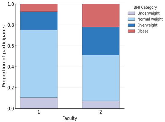The distribution of BMI categories by faculty is shown in Figure 4, highlighting a higher proportion of overweight and obese individuals among nursing students.