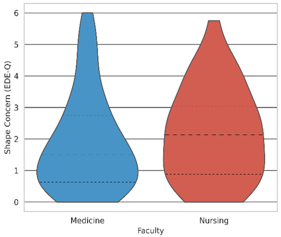 Figure 5 displays the distribution of Shape Concern scores (EDE-Q) by faculty, revealing asymmetry and greater variability among nursing students.