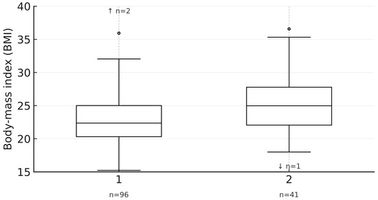 Mann–Whitney U tests were employed to compare variables between students of Medicine (N = 85) and Nursing (N = 52). A statistically significant difference in BMI was found between the two groups, with Nursing students having a higher median BMI (Median = 24.98) compared to Medicine students (Median = 22.36), U = 1354.00, p = 0.004.
