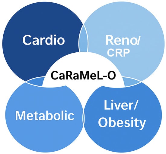 Schematic representation of the CaRaMeL-O framework (Cardio-Reno-Metabolic-Liver/Obesity). The model integrates four interconnected domains—cardiovascular, renal, metabolic, and hepatic/obesity components—reflecting the multidimensional interplay that characterizes cardio-metabolic disorders.