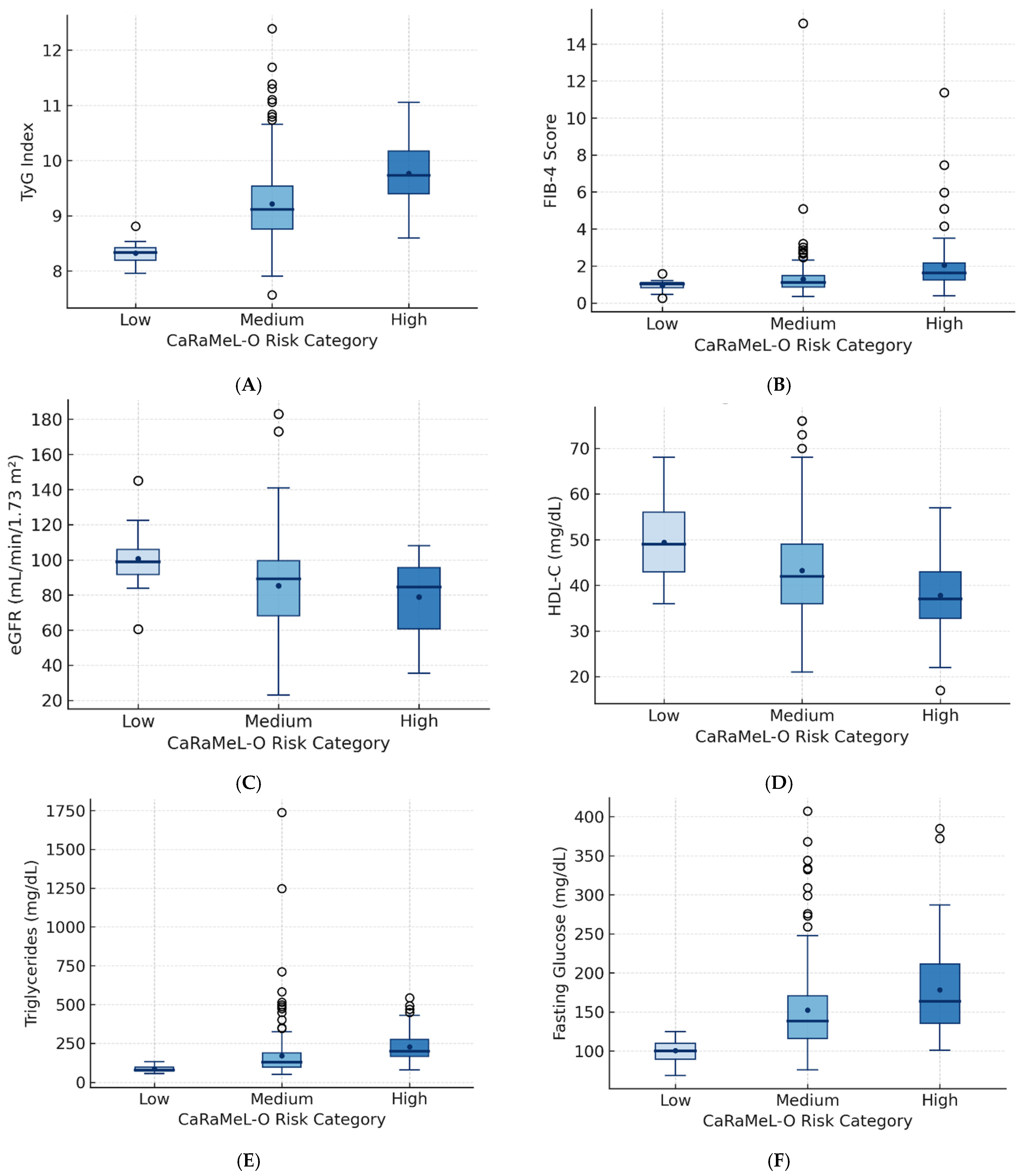 The subsequent comparative analyses explore how key biochemical indicators—including the TyG index, FIB-4, eGFR, HDL-C, triglycerides, fasting glucose, and CRP—vary across these risk strata, revealing progressive deterioration of metabolic and hepatic parameters in tandem with increasing CaRaMeL-O risk.