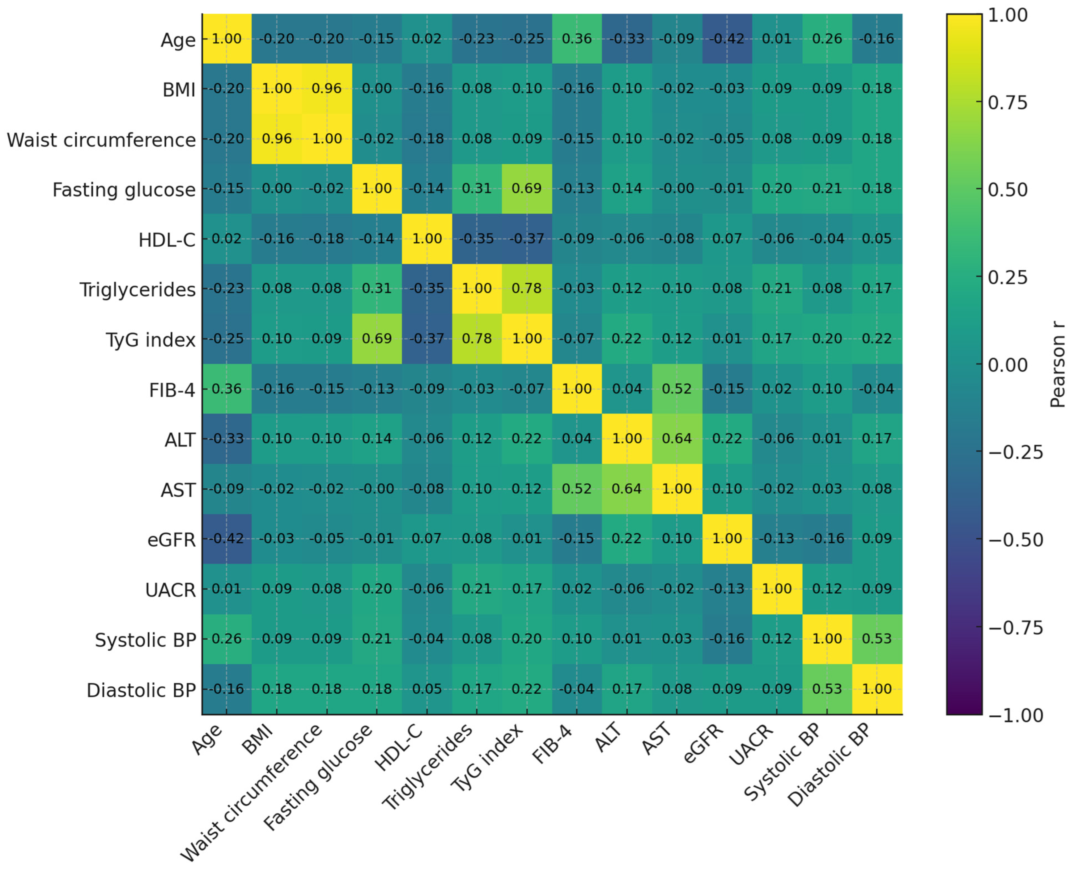 In Model A, age emerged as the strongest determinant of FIB-4 (standardized β = 0.33, p < 0.001), while BMI (β = −0.11, p = 0.034) and HDL-C (β = −0.12, p = 0.029) showed modest inverse associations. TyG, triglycerides, and eGFR were not independently associated with FIB-4. In Model B, eGFR was predominantly determined by age (β = −0.45, p < 0.001), with weaker, borderline associations for BMI (β ≈ −0.10, p = 0.063) and UACR (β ≈ −0.10, p = 0.099). VIF values were between 1.0 and 2.8 in both models, indicating absence of problematic multicollinearity.