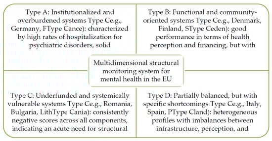 The novelty of this research lies in applying an integrated approach to a set of indicators that are rarely analyzed together in a pan-European perspective, proposing a conceptual and empirical framework for understanding the synergies and tensions between psychiatric needs and systemic resources. By identifying the common components and structural factors that shape European diversity in mental health, the resulting findings offer a solid scientific basis for informing public policy, guiding strategic resource allocation, and supporting the development of contextualized intervention models. An original contribution to the literature on mental health governance is achieved through the development of a structural taxonomy that links population needs with resource availability and efficiency. An empirical framework is also provided to facilitate the formulation of differentiated public policies grounded in the psychosocial realities of each Member State.