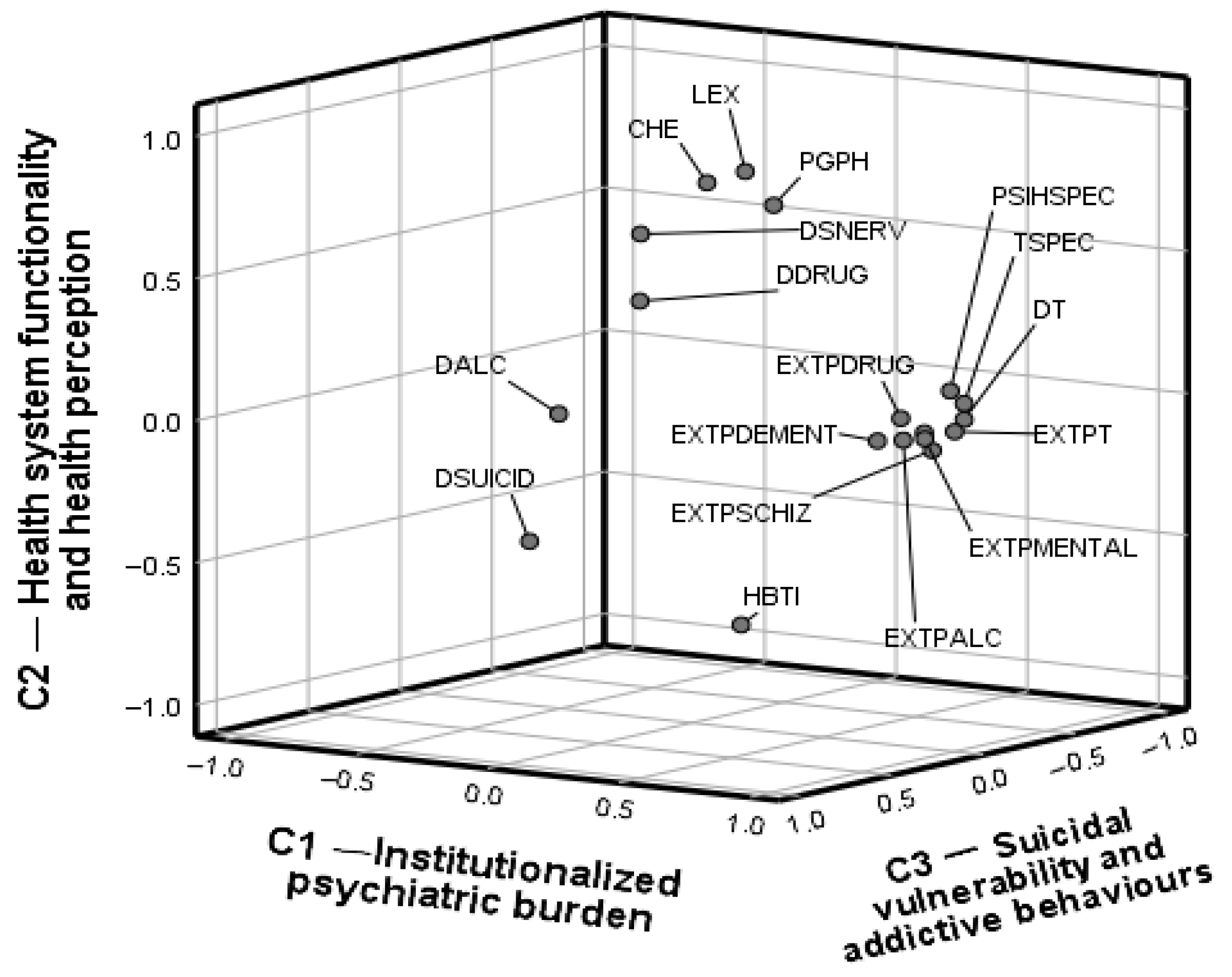 | Variable | C1—Institutionalized Psychiatric Burden | C2—Health System Functionality and Health Perception | C3—Suicidal Vulnerability Associated with Addictive Behaviours |