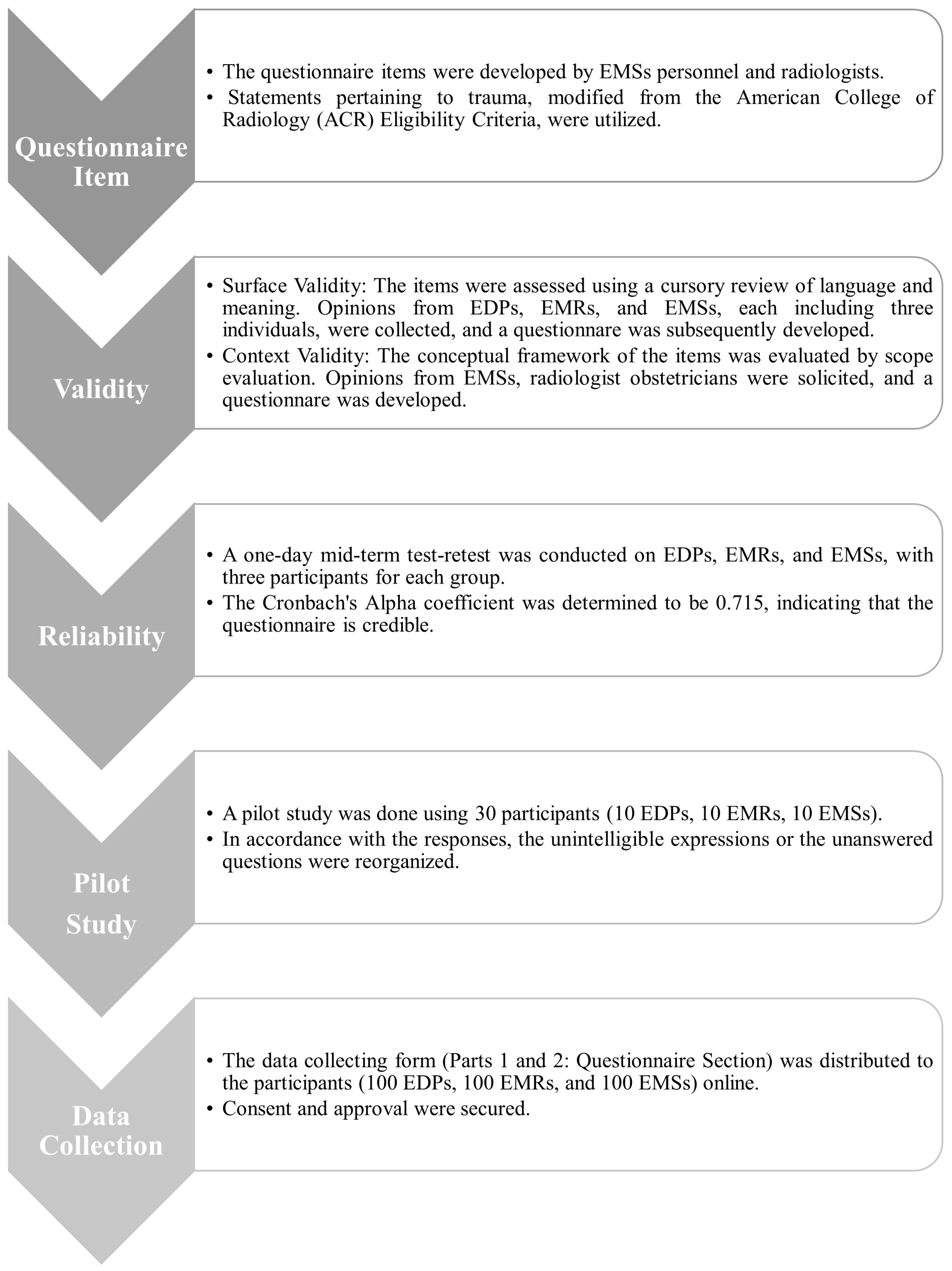 | Q11 | If the traumatized pregnant woman is unstable or if there is evidence of severe trauma in the patient, it is important to choose CT as the first choice when choosing between MR or CT. | EDPs (n) | 45 | 55 |