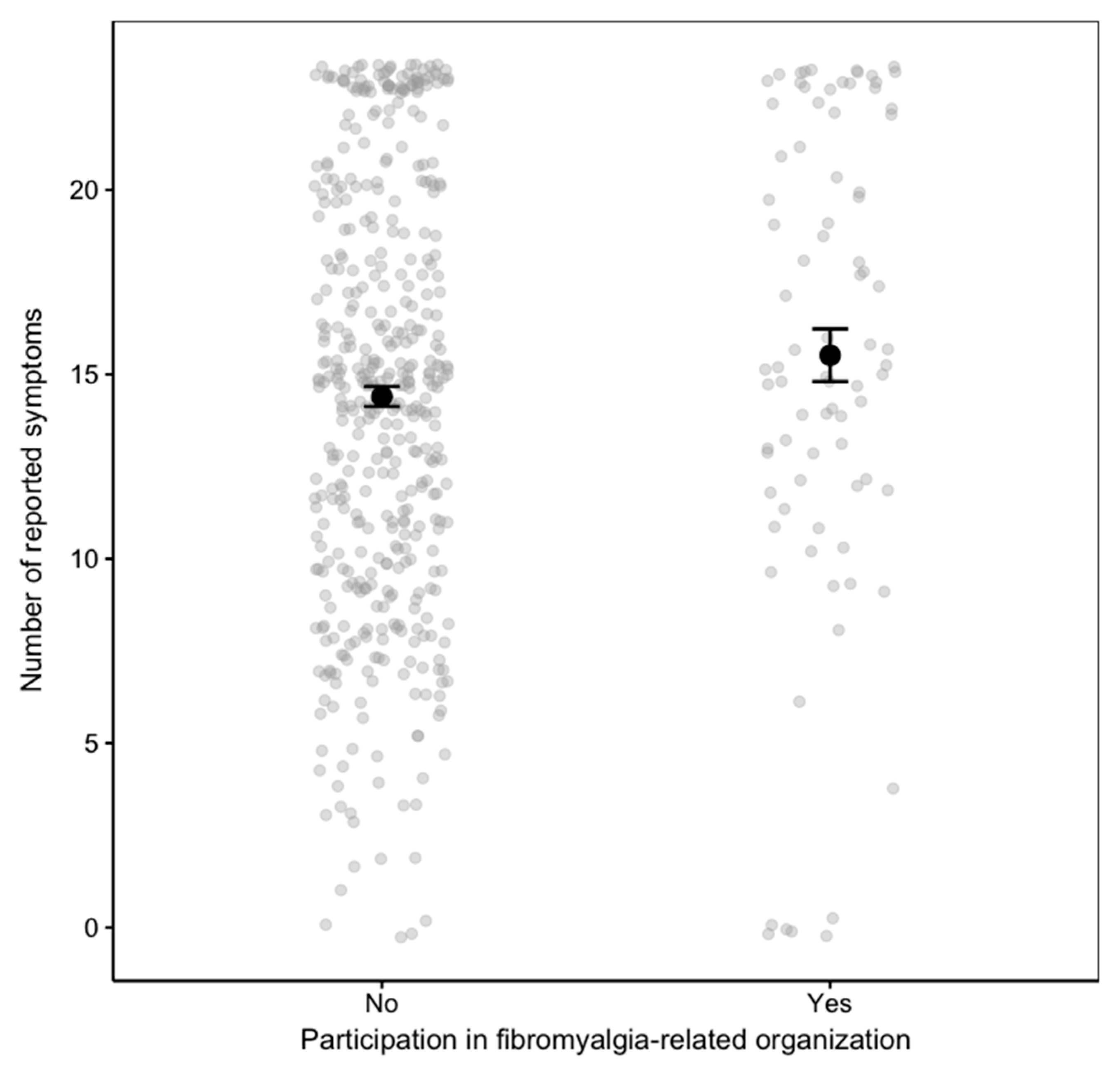 | Number of Symptoms | Social Dimension (M1) | (P51) Participation in a fibromyalgia-related organization |