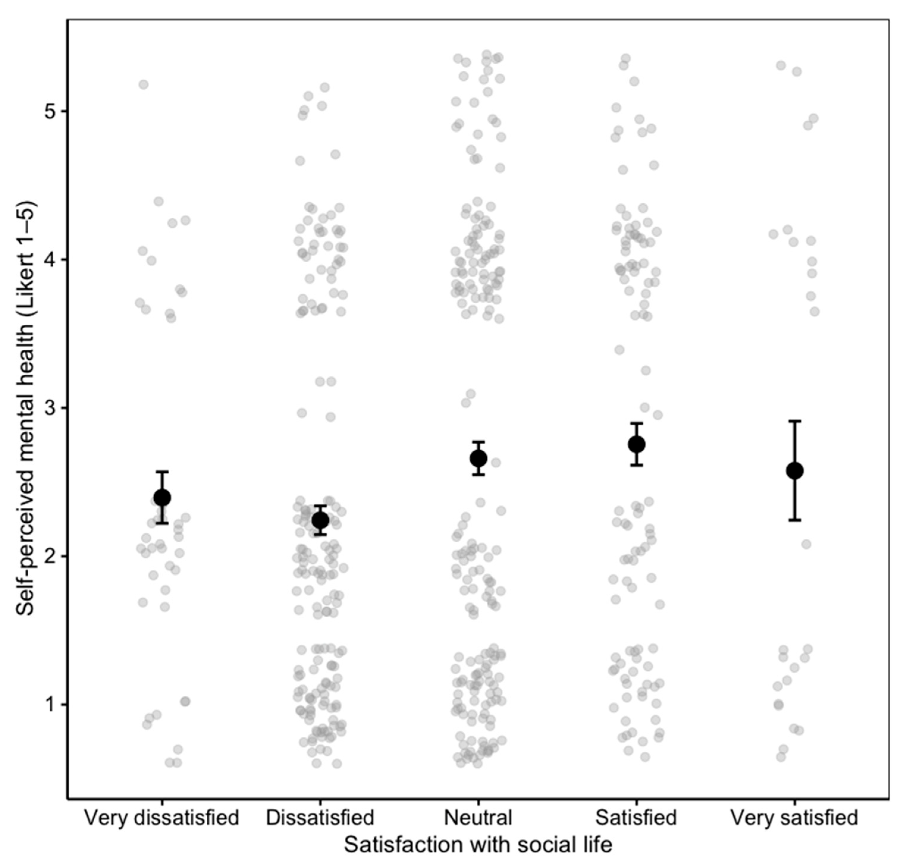 | Social Dimension | P54 | Overall, how satisfied are you with your social life? | 5-point Likert | 1–5 | 539 | 2.81 | 1.00 |