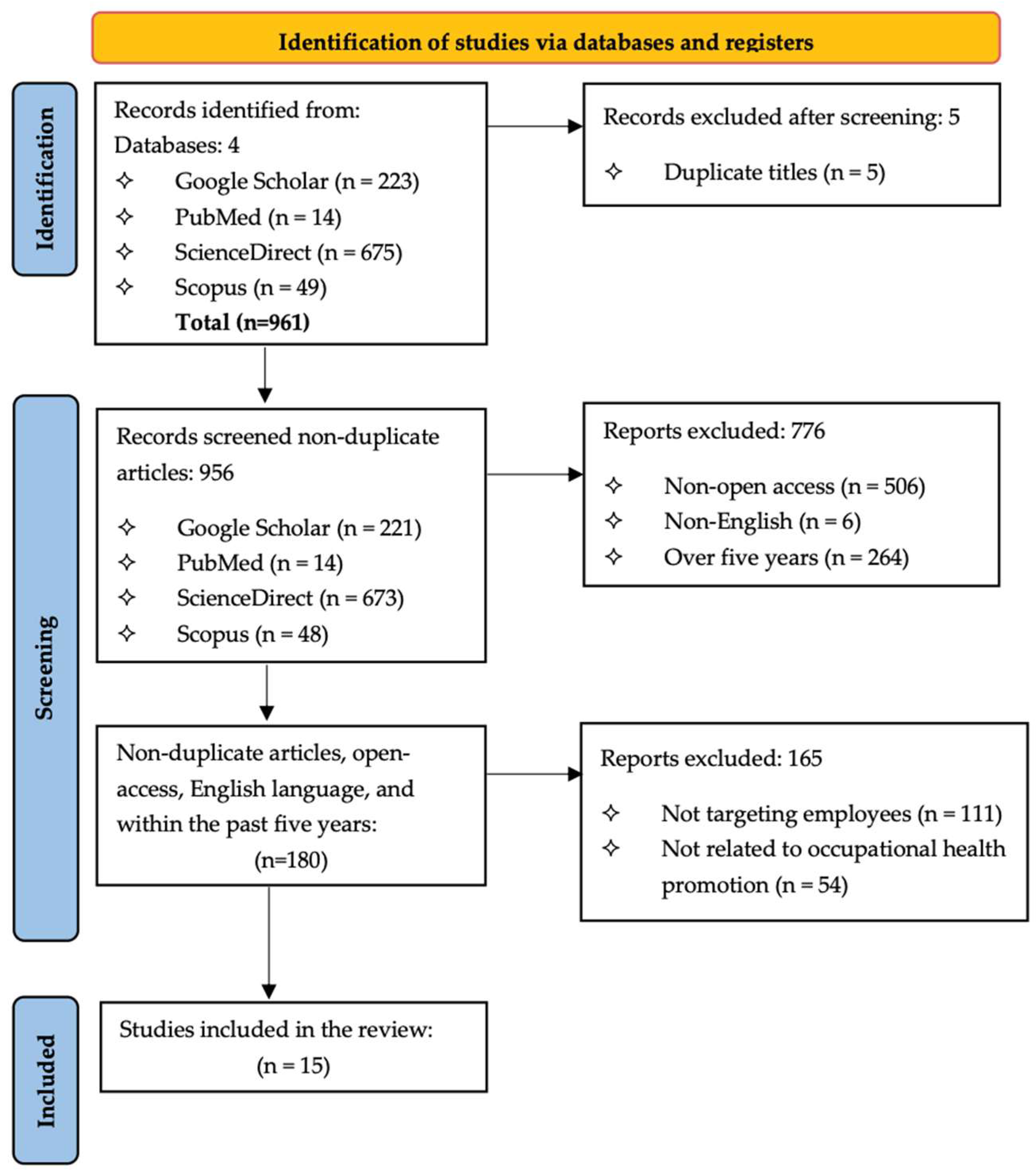 | Intervention | Interventions involving any form of occupational health promotion | Interventions unrelated to occupational health promotion |