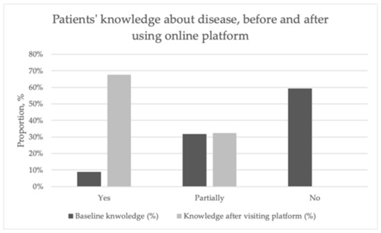 Considering that the online platform functions as a patient education tool, bringing information from international guidelines translated into Romanian and non-technical language, we asked questions about how patient health literacy was improved after using the platform and the level of medical knowledge, as shown in Figure 3. In this figure, we composed questions about the disease related to knowledge before accessing the platform about diagnosis, monitoring, prognosis, and treatment. We compared them with the answers to the question about knowledge after accessing the platform.