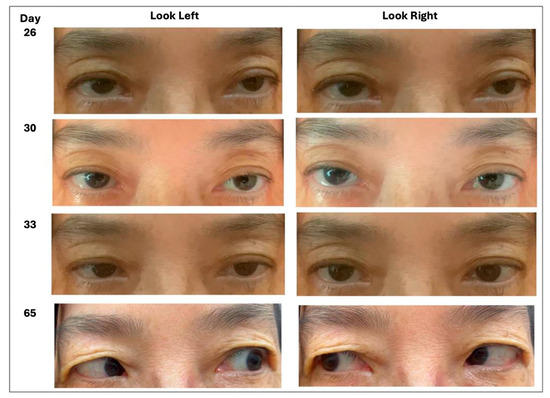 Progressive improvement in horizontal gaze corresponding to the clinical timeline (Day 26 = start of TENS; Days 29–33 = early improvement; Day 65 = follow-up).