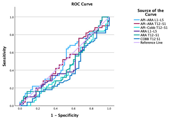 Receiver operating characteristic (ROC) plots for API-ARA L1-L5, API-ARA T12-S1, and API-Cobb T12-S1, as well as global lordosis measures of ARA L1-L5, ARA T12-S1, and Cobb T12-S1. None of the parameters of API—lumbar lordosis values (ARA L1-L5, ARA T12-S1, and Cobb T12-S1) or lumbar lordosis curve measures (ARA L1-L5, ARA T12-S1, and Cobb T12-S1) demonstrated good classification ability between controls and ALBP groups.