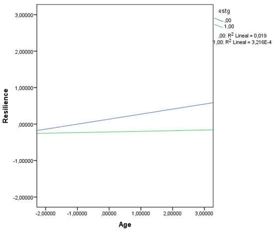 As depicted in Table 3, there were significant main effects of both stress exposure, B = −0.35, SE = 0.11, p = 0.0009, and age, B = 0.10, SE = 0.05, p = 0.030. However, the interaction between age and stress exposure was not statistically significant, B = −0.12, SE = 0.10, p = 0.245, suggesting that the effect of age on resilience did not differ significantly across levels of stress exposure. Nonetheless, conditional effects analysis showed in Table 4 revealed that at low levels of stress exposure (−1 SD), age significantly predicted greater resilience (B = 0.14, SE = 0.06, p = 0.016), whereas at high levels of stress exposure (+1 SD), the relationship was not significant (B = 0.02, SE = 0.09, p = 0.839). This interaction is also represented in Figure 1.