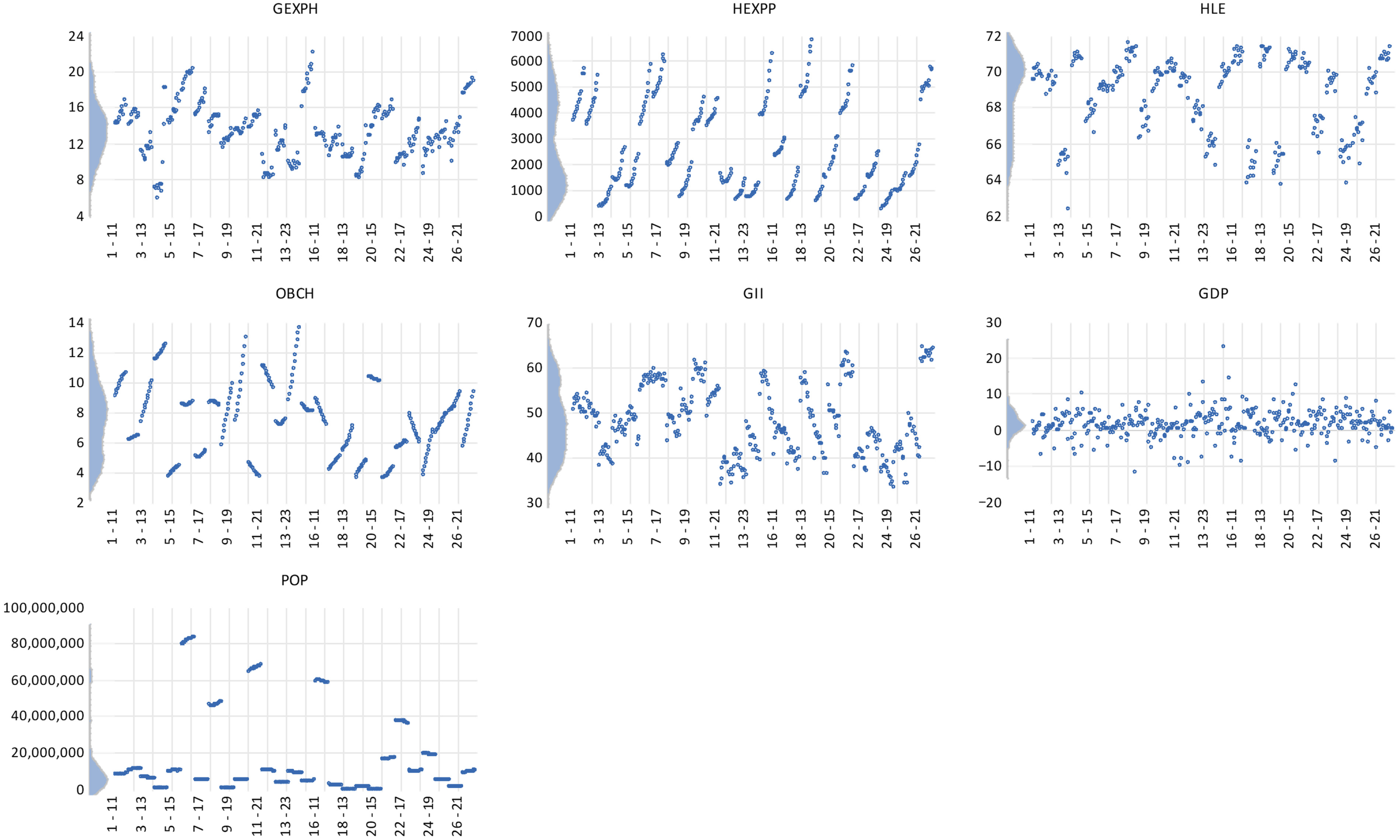The normality diagnostics indicate mixed distributional properties across variables. Jarque–Bera tests confirm non-normality for most indicators (p < 0.01), including HExpP, HLE, OBCh, GII, GDP growth, and population—supporting the use of econometric techniques robust to non-Gaussian distributions, such as quantile regression. GExpH is the only variable approximating normal distribution (p ≈ 0.35), reflecting its more uniform policy alignment across states. Skewness patterns further highlight structural dynamics: HLE is negatively skewed, suggesting clustering toward higher life expectancy levels, while population and GDP display right-skewed tails driven by outlier countries with large populations and atypical economic volatility. Kurtosis values above 3 for GDP and population indicate heavy-tailed distributions, reinforcing the need for distribution-sensitive models rather than mean-based estimators. Overall, the descriptive evidence supports the empirical strategy by demonstrating that health outcomes, expenditures, and innovation capacity vary meaningfully across member states and cannot be adequately summarized through central tendency measures alone.