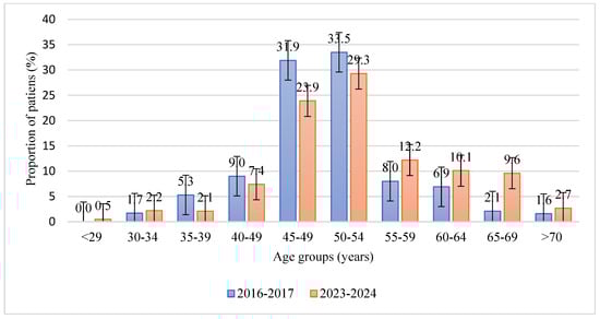 Age distribution of patients with endometrial hyperplasia in two study periods (2016–2017 and 2023–2024). Bars show the proportion of patients in each age group (%); error bars represent 95% confidence intervals. The y-axis is limited to non-negative values, and confidence intervals were truncated at 0% where necessary.