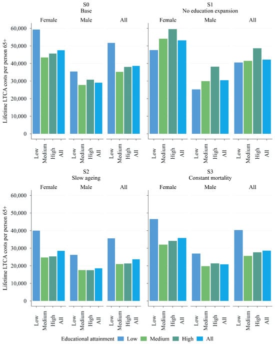 Education-related differences in care needs have a substantial impact on lifetime LTCA costs. Figure 2 illustrates the average lifetime LTCA costs for individuals in the 65–75 age cohort at the start of the simulation, stratified by education and sex. The upper-left panel shows the results for the baseline scenario, S0. Individuals with lower education levels face significantly higher overall lifetime costs. This disparity is evident for both sexes, but it is particularly pronounced among women. In contrast, the differences in lifetime costs between older adults with medium and high educational attainment are relatively small.