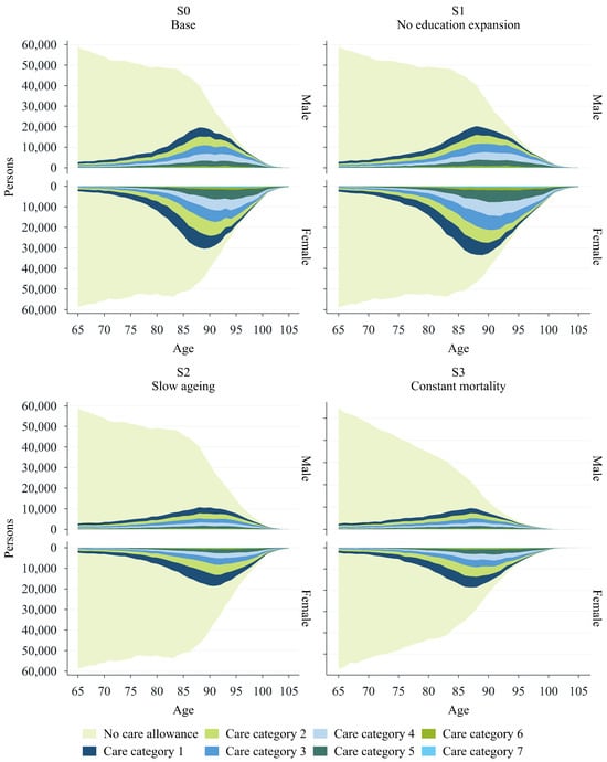 Finally, both the slower-ageing scenario (S2) and the constant-mortality scenario (S3) represent alternative outlooks for population health and care demand. While S2 projects a slower increase in both the demand for care and the severity of care needs (and corresponding allowance categories) through a decelerated ageing process, S3 is based on the assumption of constant mortality (arranged by age and sex). A comparison of S3 with S0 thus highlights the effects of ongoing improvements in mortality. Conversely, S2 assumes that individuals not only live longer but also live with better health. In this scenario, we assume that, from 2025 onwards, people aged 65 and over will age more slowly. For care-related processes, we apply a person’s “care age”, which is defined so that people 65+ age by only four years every five years, meaning they only have a birthday every 1.25 years. A person aged 70 will then have a “care age” of 69, a person aged 75 will be 73, and so on, and 90 will be the new 85, thus adjusting age to increasing life expectancy. Put differently, while the baseline scenario implicitly assumes that individuals live longer but have more years with care needs (expansion of morbidity), the comparison to S2 highlights the potential mitigating effect of health improvements despite increasing life expectancy (compression of morbidity) [7,14].