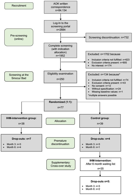 This randomised, two-arm, controlled, monocentric, interventional clinical trial was conducted at the SINOCUR Prevention Centre in Bad Kötzting, Germany. The centre is part of a centrally coordinated health promotion network called ‘IHM Campus’. The study compared an intervention group (IHM) with a control group who were placed on a six-month waiting list for the IHM programme. All participants underwent a main observation period of six months, with the intervention group undergoing further longitudinal examinations until the end of the 12-month lifestyle programme. Additionally, patients in the waiting list group were compared with themselves after receiving the intervention, using a crossover design. The study was pre-registered with the German Clinical Trials Register Freiburg (DRKS, file number DRKS00013040, registration date 1 October 2017). Participants were required to provide written informed consent. The study protocol was submitted to the Ethics Committee of the Medical Faculty of the Technical University of Munich (TUM; ref. 278/17S on 4 August 2017) for review of ethical and legal compliance, as the TUM is responsible for the principal investigator.