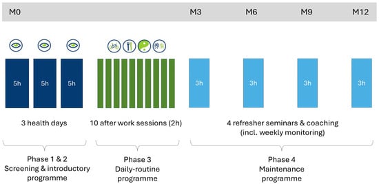 The 12-month IHM lifestyle intervention programme includes various phases and training packages, supported by a web-based health portal (viterio.de). During the first three months, participants receive intensive lifestyle counselling: three health days (induction phase) and ten weekly after-work seminars (training phase). This is followed by a nine-month maintenance phase: weekly monitoring by health coaches, remote lifestyle counselling as needed, and half-day refresher courses (see Figure 2). Successful participation is defined as attending seven of the ten after-work seminars and at least three of the four refresher days between months three and twelve.