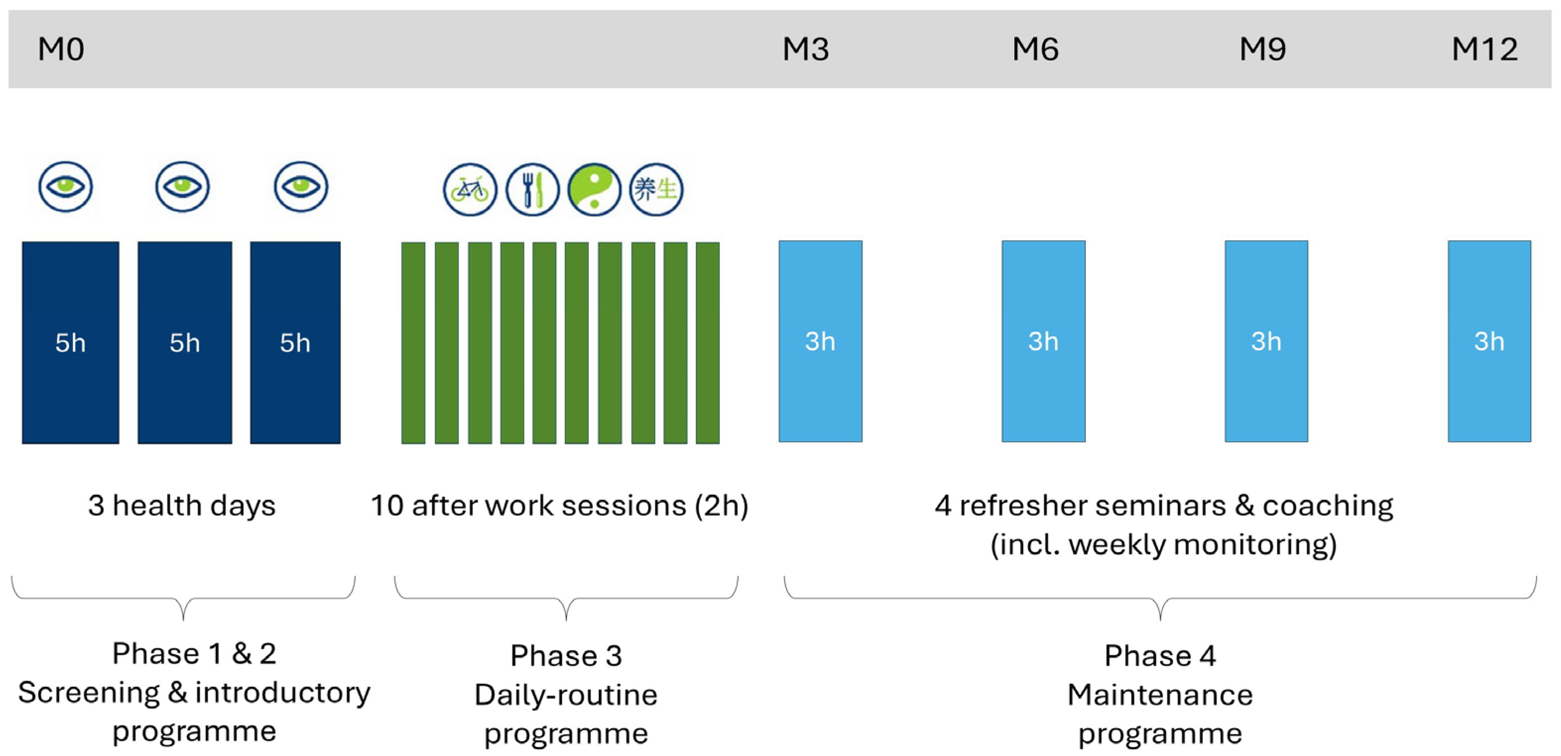 - Melchart, D.; Wühr, E.; Wifling, K.; Bachmeier, B.E. The TALENT II study: A randomized controlled trial assessing the impact of an individual health management (IHM) on stress reduction. BMC Public Health 2018, 18, 823. [Google Scholar] [CrossRef]