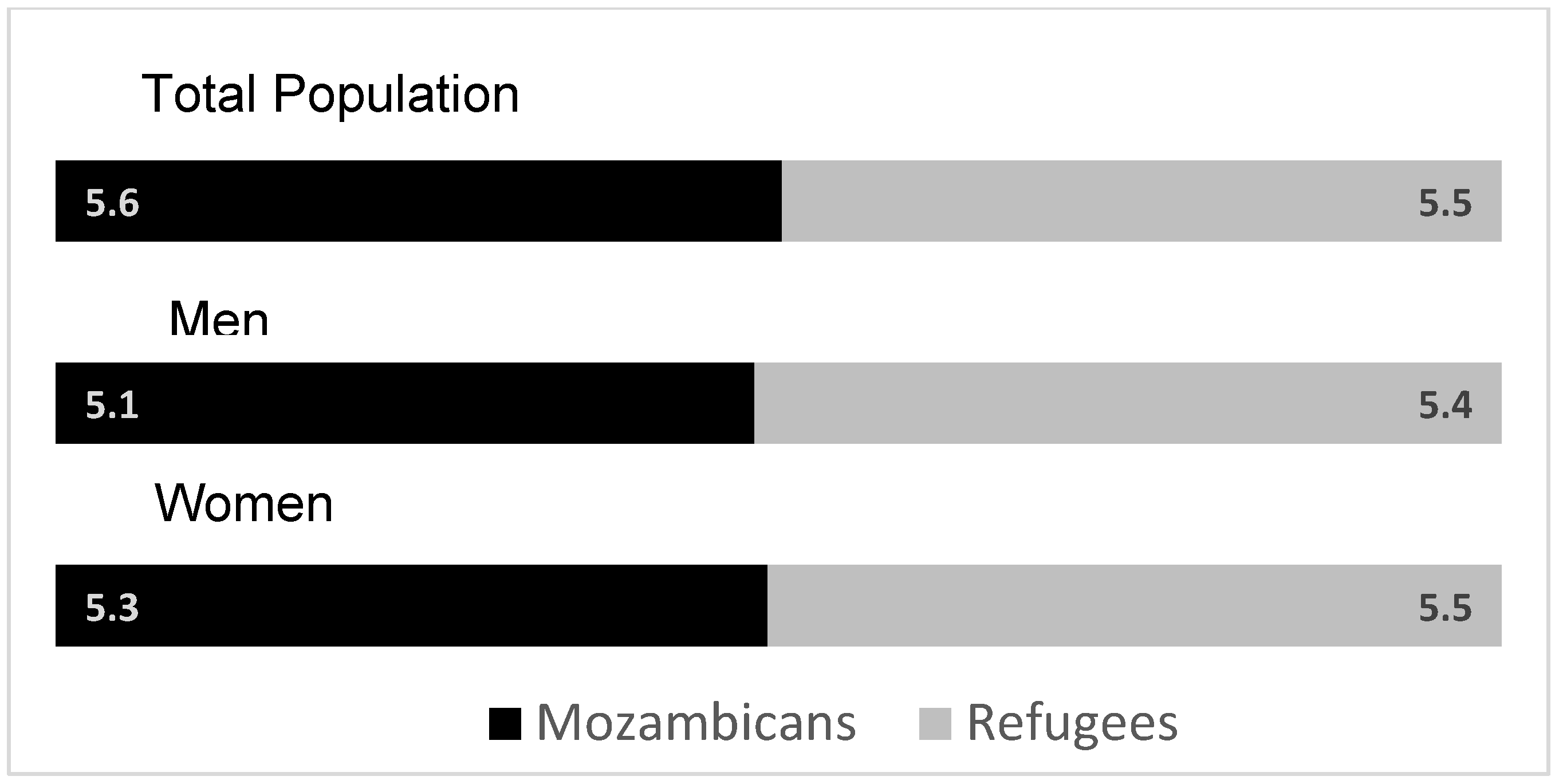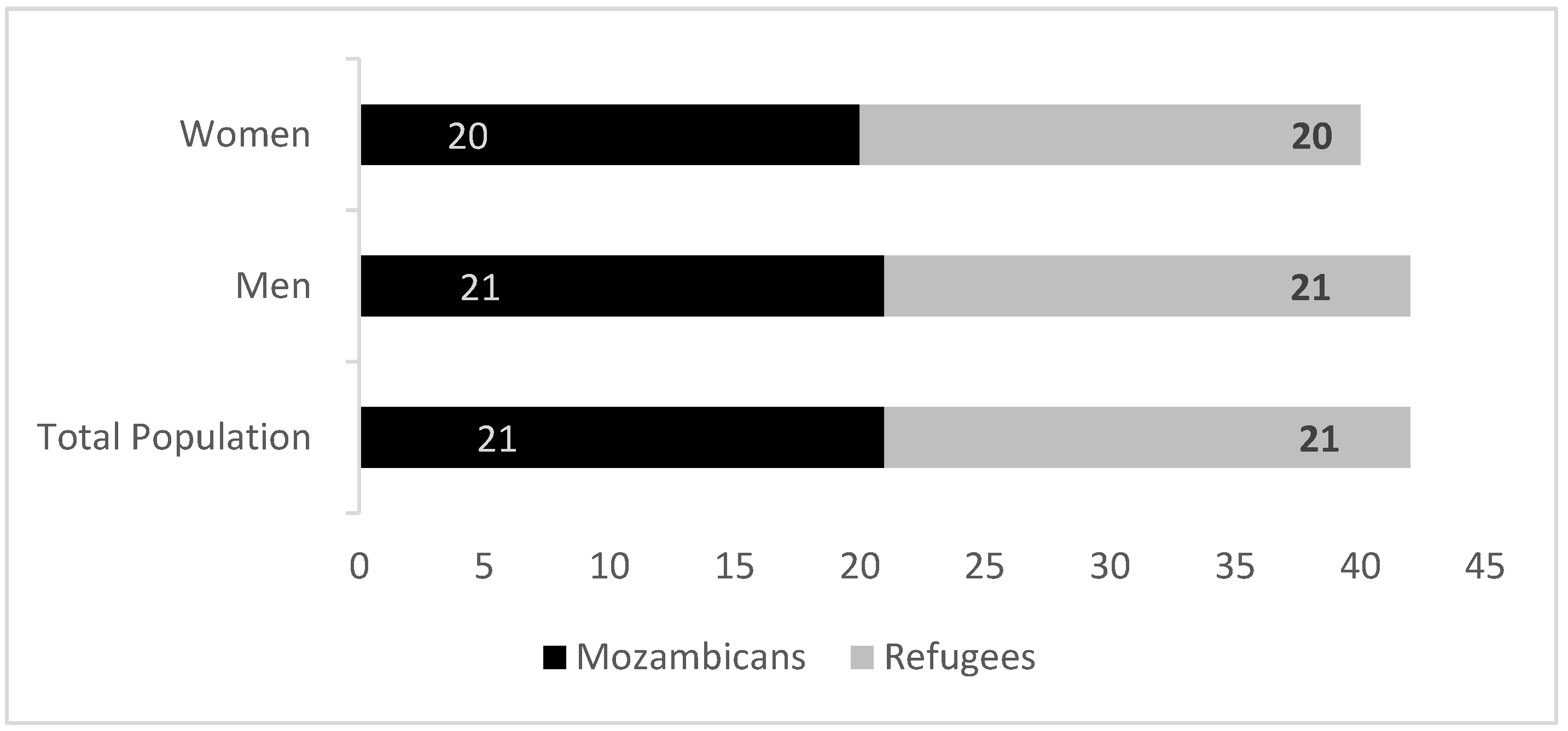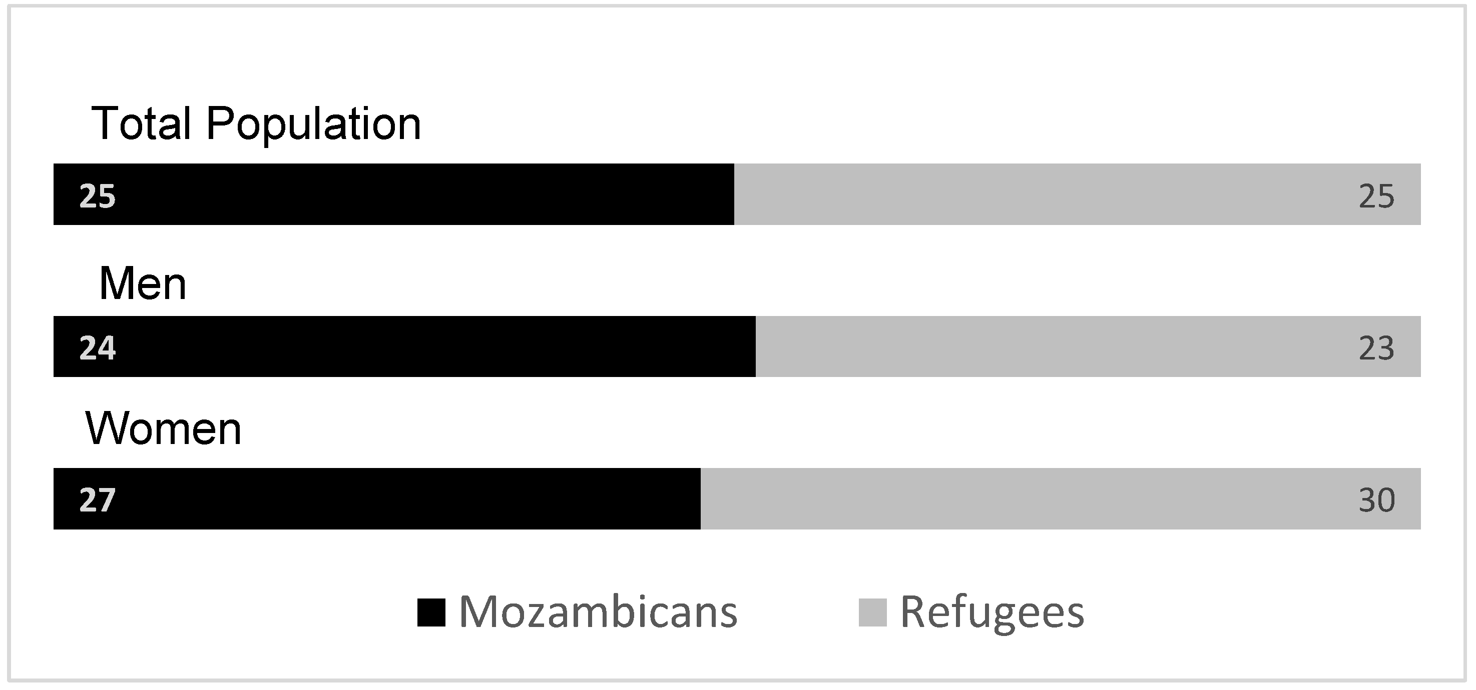 | Pooled Sample | Refugees | Mozambicans | Pooled Sample | Refugees | Mozambicans | |