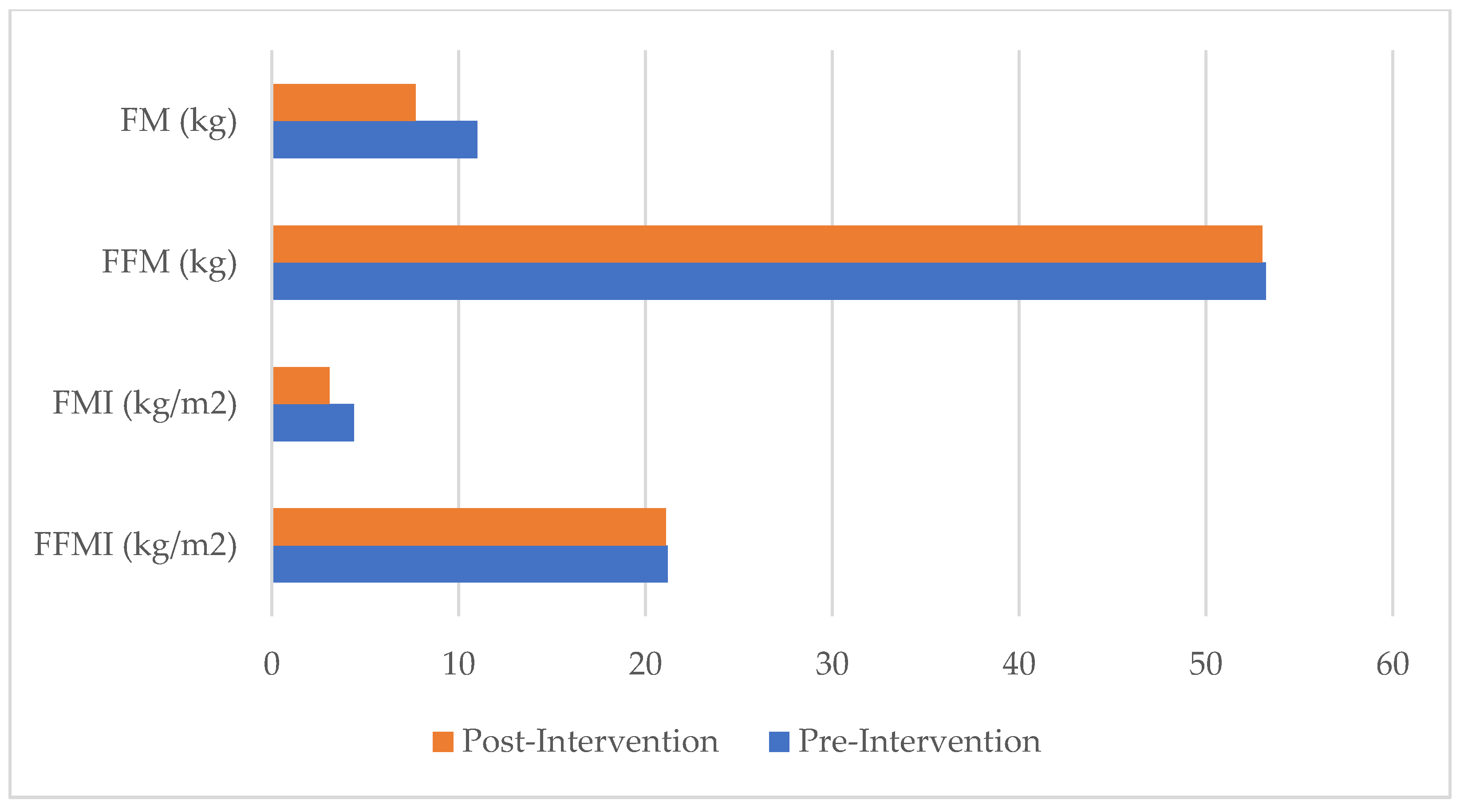 | FFMI (kg/m2) | 21.18 | 21.10 | −0.08 | −0.4 |