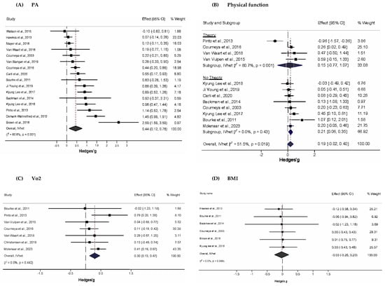 Forest plot for standardized effect size changes in (A) PA, (B) Physical function, (C) VO2, and (D) BMI (Hedge’s g). The black-filled squares, sized according to the weight contributing to the overall effect, represent changes in PA from each study, while the left and right extremes of the squares represent the lower and upper 95% confidence intervals for changes in PA from each study. The black diamond represents the pooled effect size change in PA, while the left and right extremes of the diamonds represent the pooled lower and upper 95% confidence intervals for changes in PA. The red dashed vertical line through the middle of the diamond represents the pooled mean effect, while the black dashed vertical line represents the zero (0) point. % Weight: Percentage weight of a particular study [65,66,67,68,69,70,71,72,73,74,75,76,77,78,79,80,81,82,83].